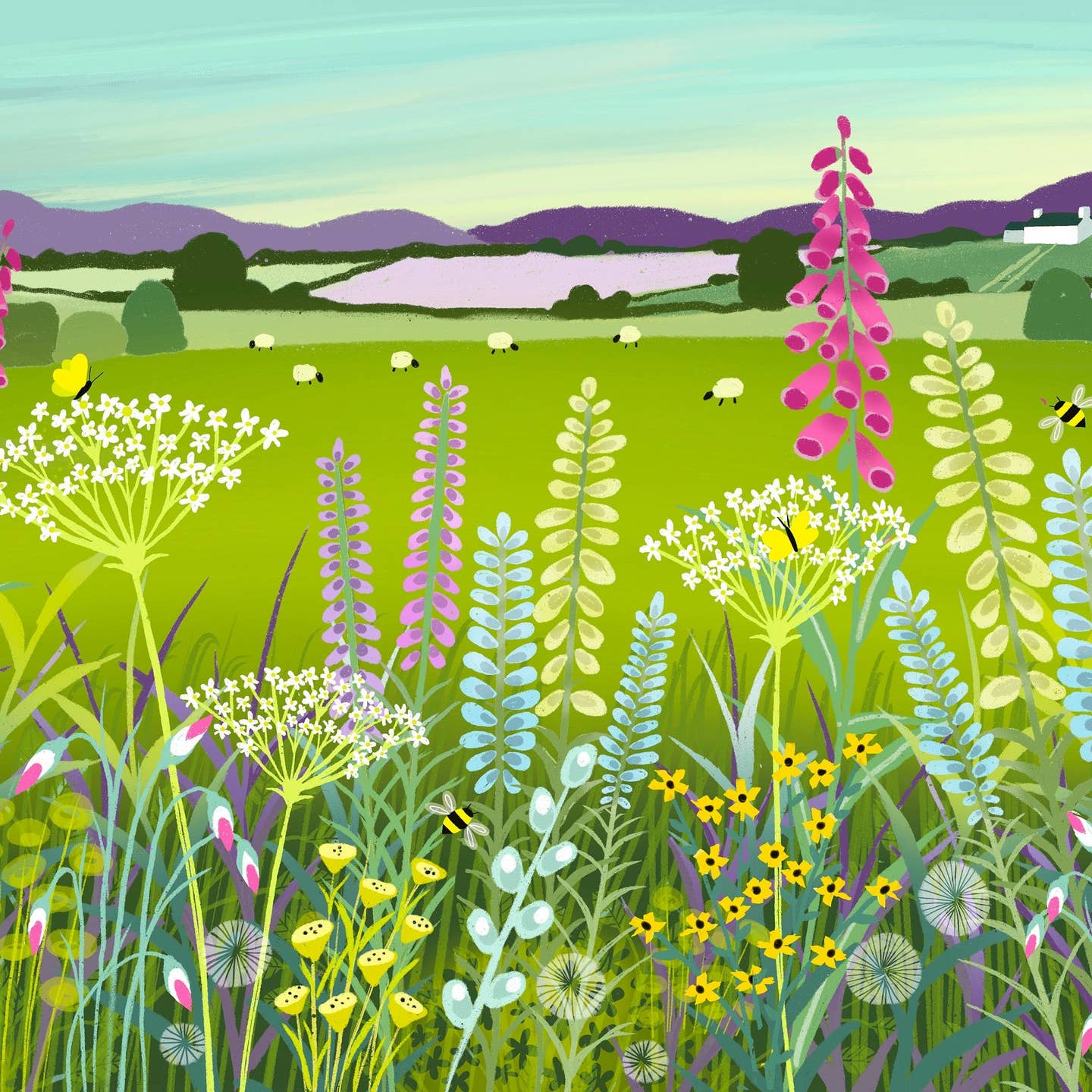 A bright, colourful signed art print of 'Galloway Glory' from an original painting of the fields and farmlands leading up to the Galloway Hills by Caroline Smith of Galloway Arts.