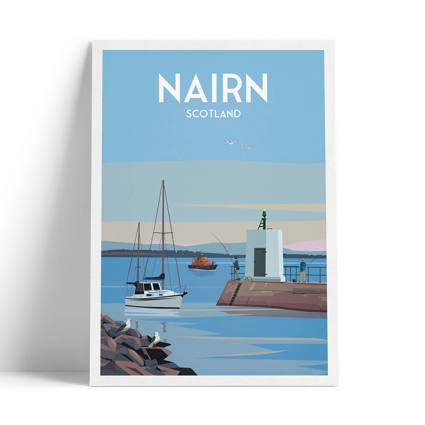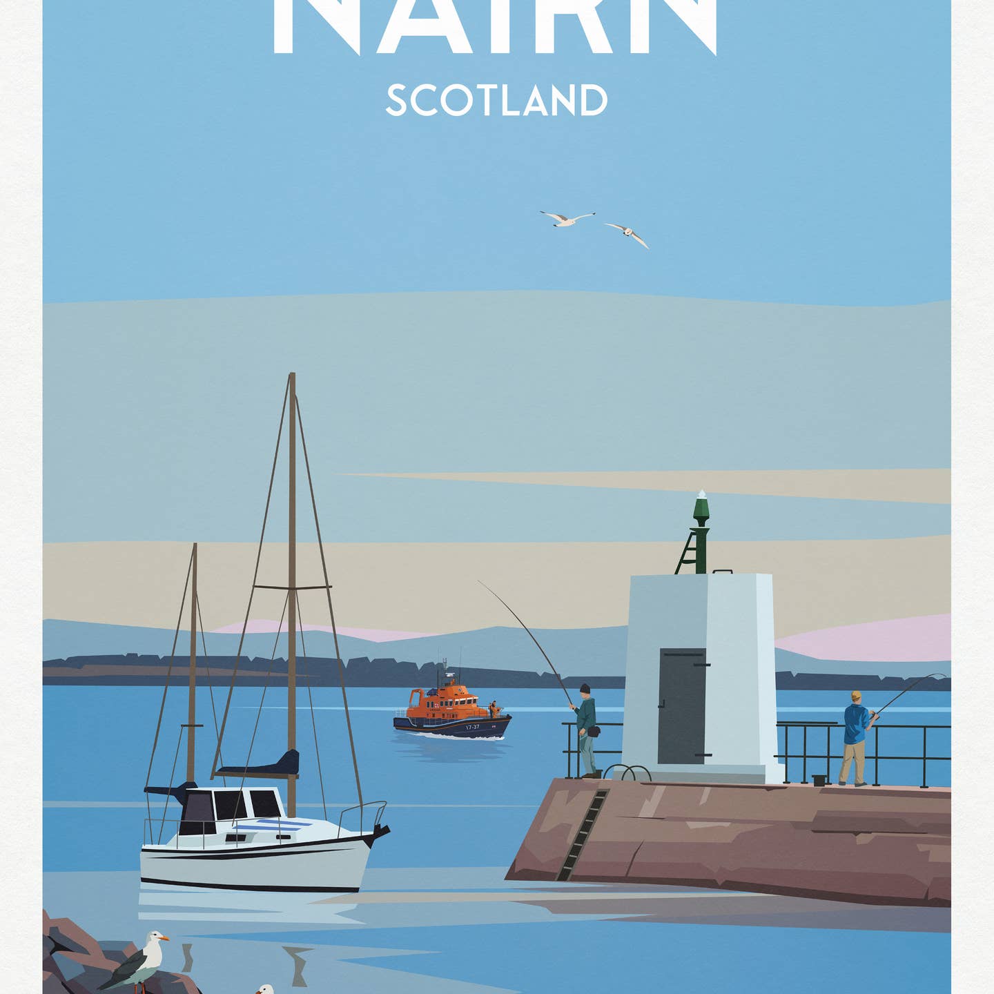 Illustration of Nairn Harbour featuring fishermen, boats and seagulls.