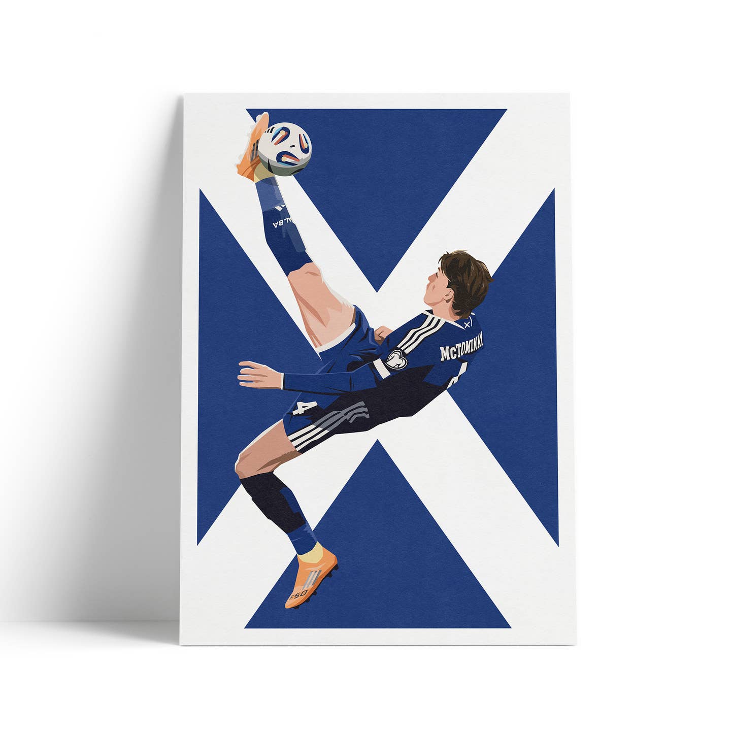 Celebrate Scotland’s footballing passion with this striking illustration of Scott McTominay in action, set against a bold Scottish Saltire backdrop.