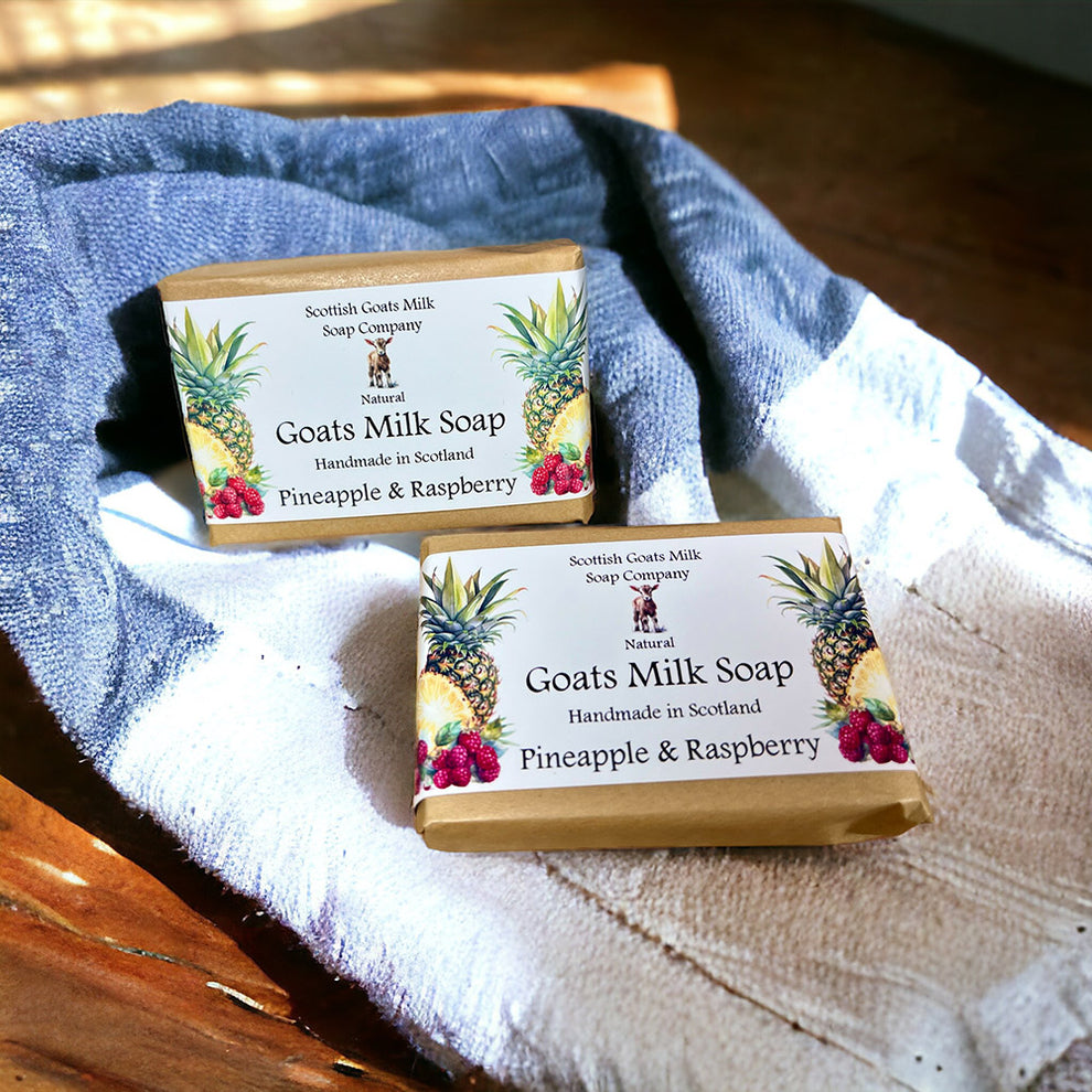 This Pineapple and Raspberry scented natural goat's milk soap bars are a little piece of paradise. Handmade with care, these luxurious bars capture the essence of tropical bliss by blending the sweet tanginess of pineapple with the juicy tartness of raspberries, creating an irresistible aroma you won’t want to miss.