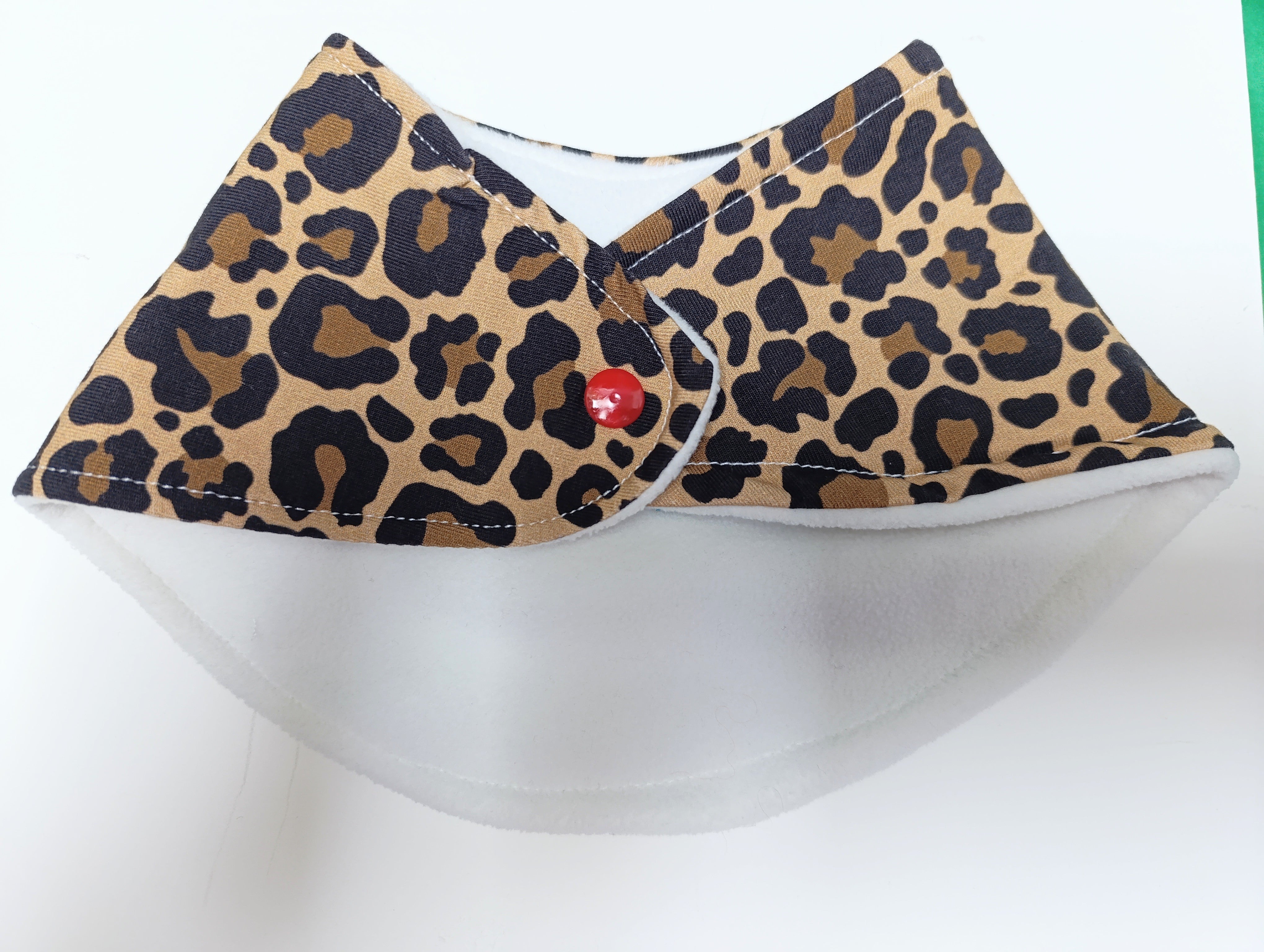Made from designer cotton fabric and fleece with a plastic popper fastener or velcro.