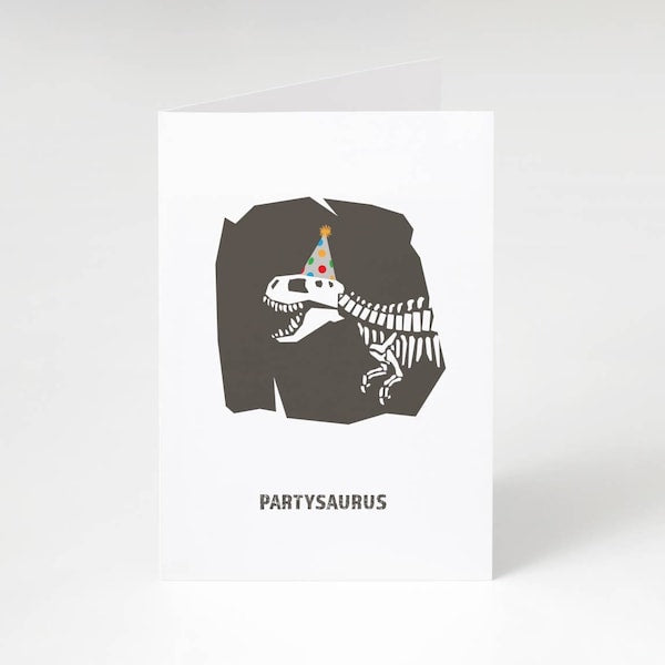 Card features a fun illustration of a dinosaur skeleton wearing a party hat. A colourful and charming birthday card.