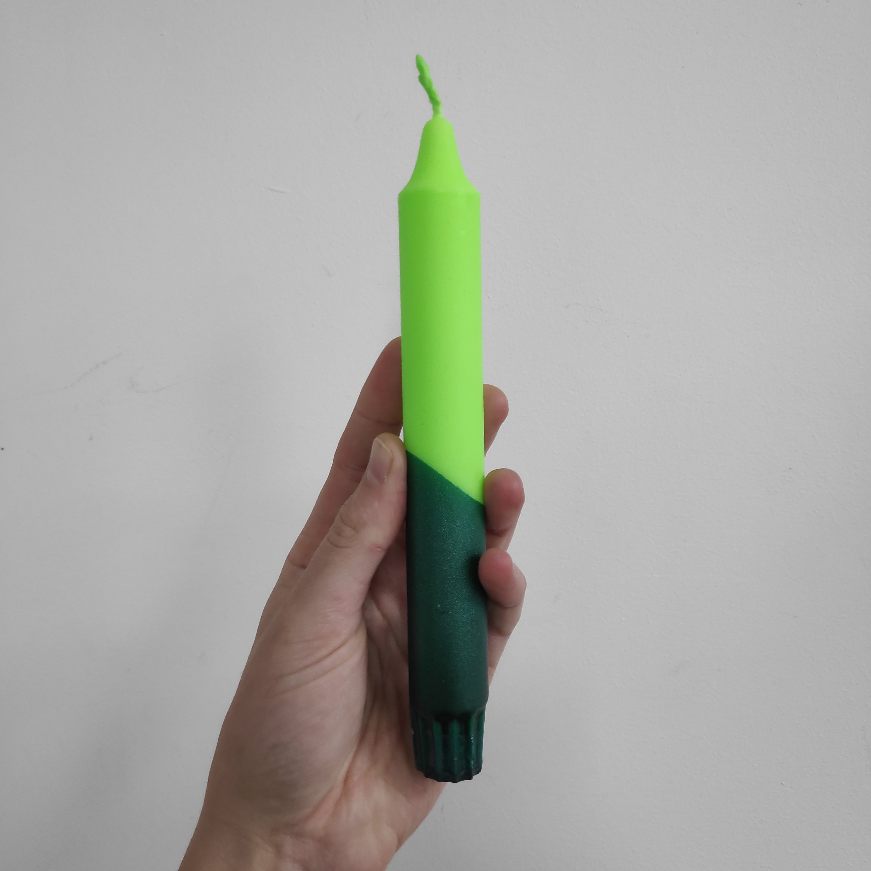 Funky dinner candles in sparkly green and neon green from Perthshire based True North Soapworks.