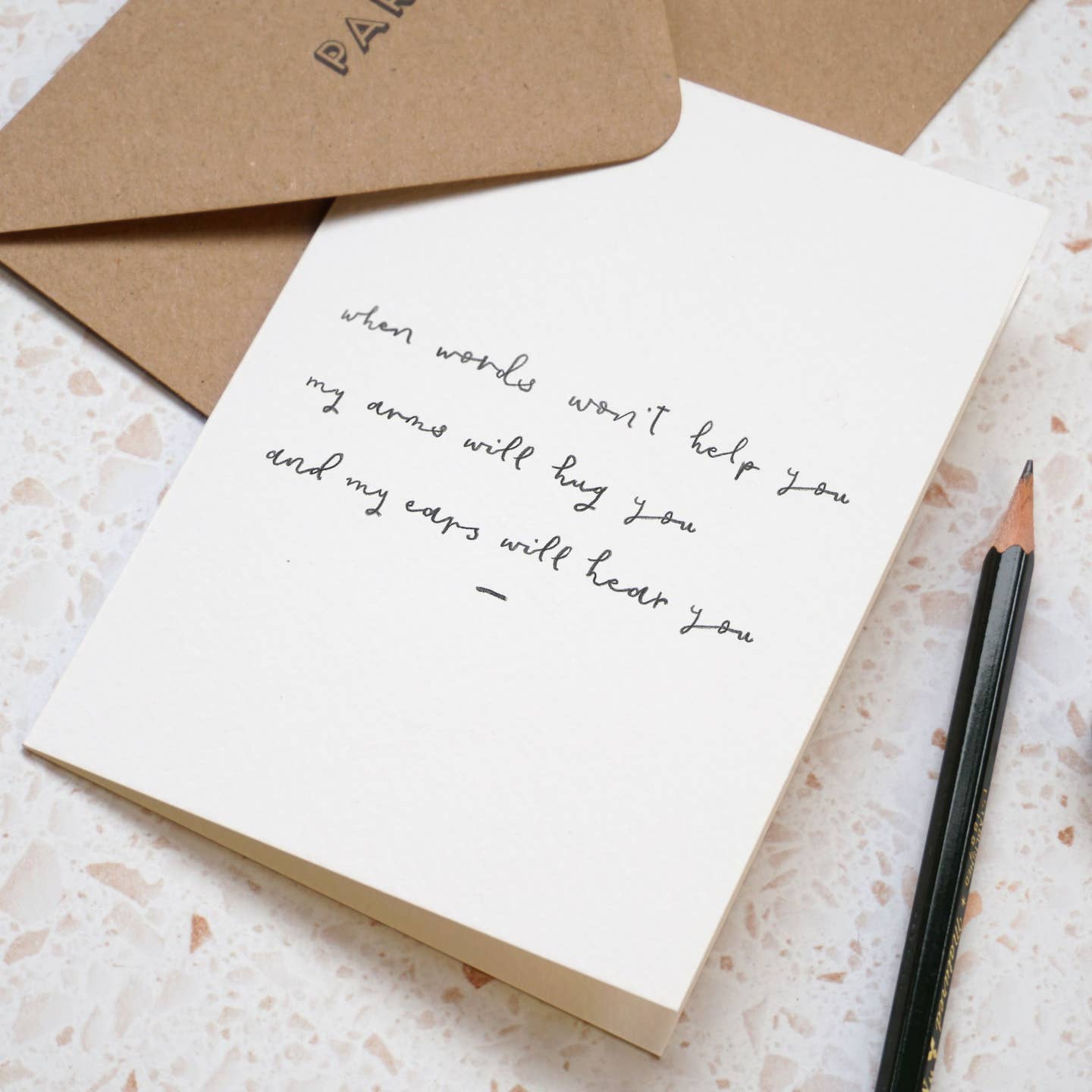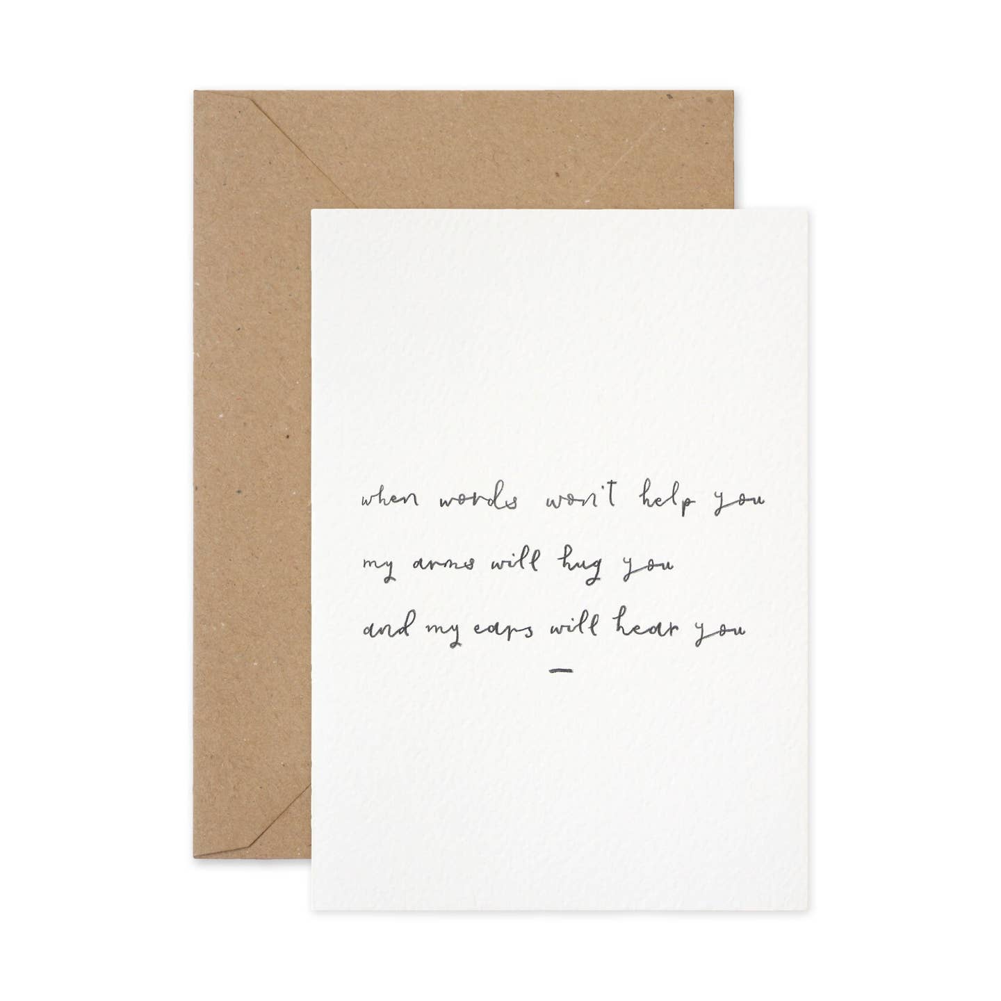 Hand lettered sympathy greeting card featuring hand lettered message reading "When words won't help you, my arms will hug you and my ears will hear you."