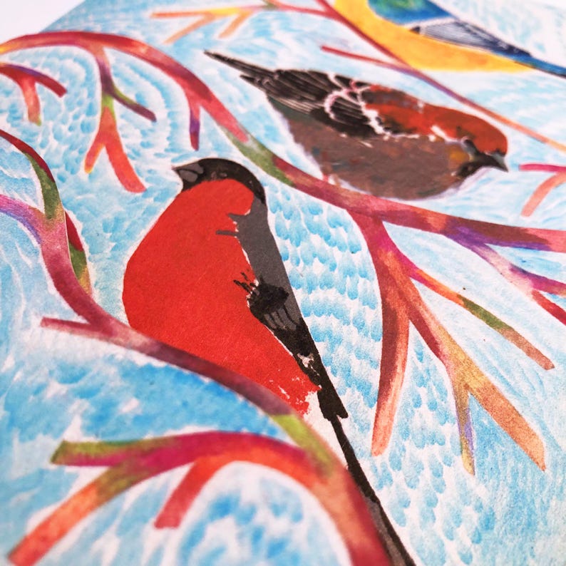 This fold-out greeting card features an illustration of four colourful birds - a bullfinch, a robin, a sparrow and a blue tit, following a curling tree branch. There is space on the reverse to write a message.