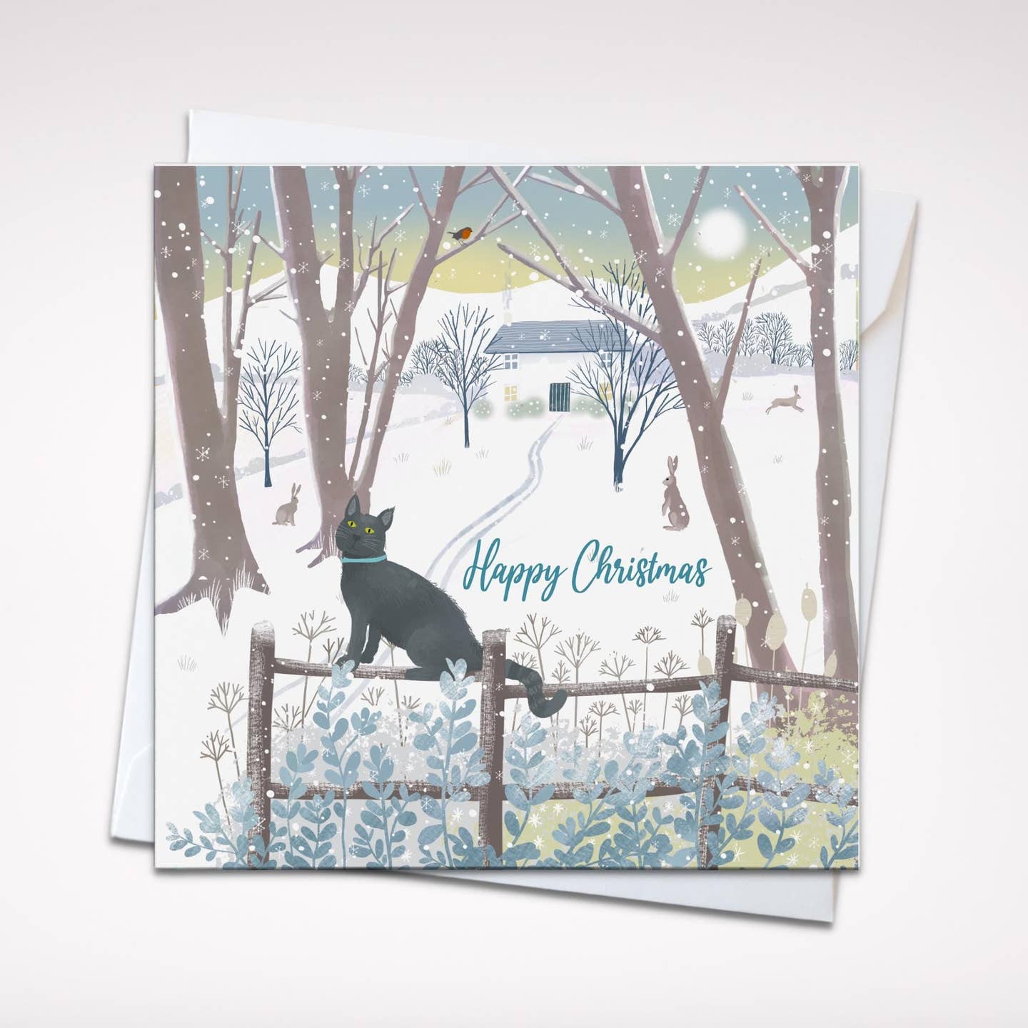 Send some holiday cheer with this delightful card featuring a snowy winter scene and Christmas Cat from original artwork by Caroline Smith of Galloway Arts. Perfect for the cat lover in your life.