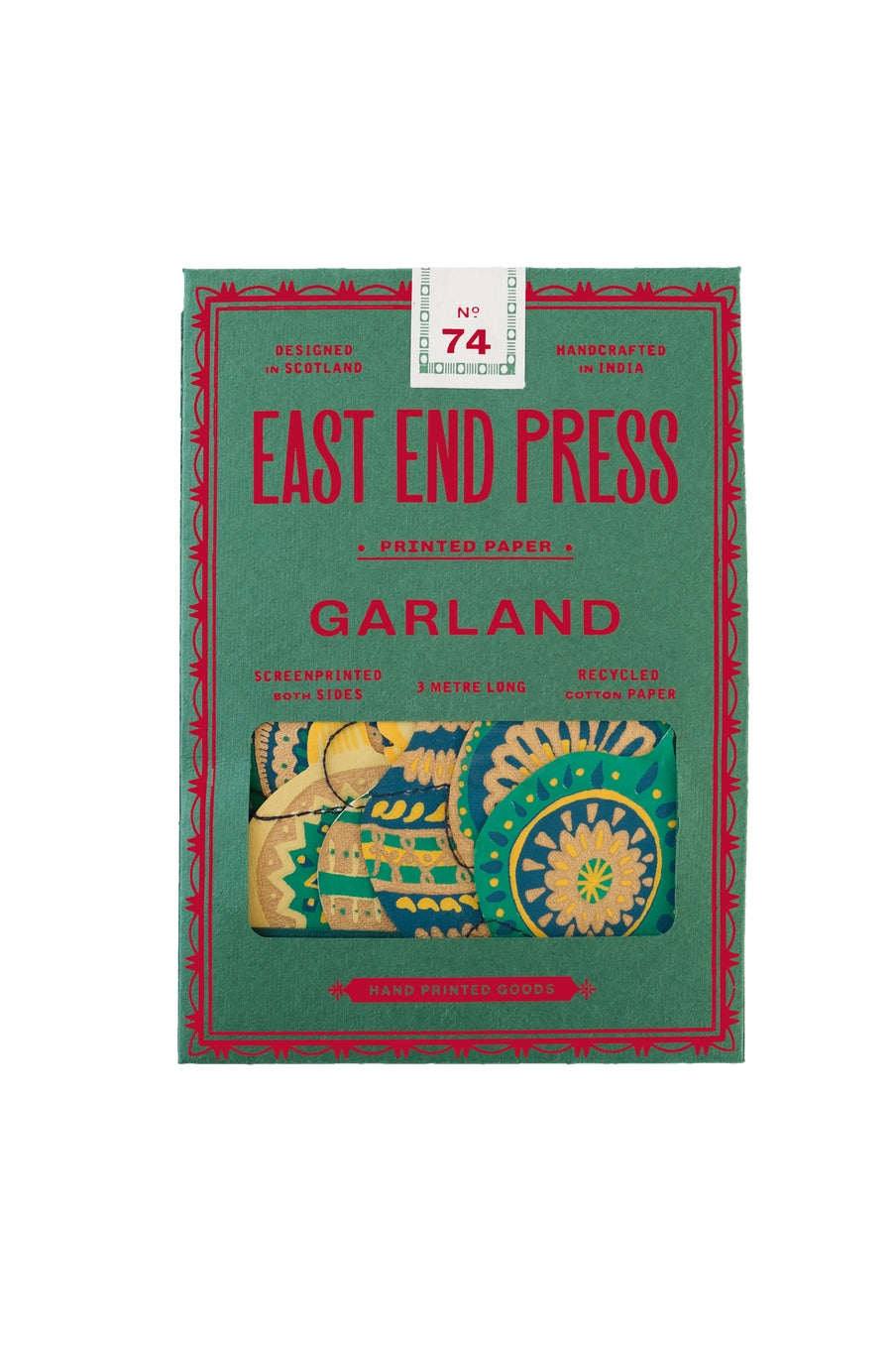 Hand printed three metre long paper garland.  The garland is screen printed on both sides on thick, hand made cotton paper.  The shapes are sewn along strong cotton thread, with hanging loops either end, meaning you can hang your garland straight away!