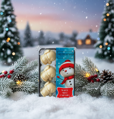 Delight in the festive charm of Chocolatbox's handcrafted Christmas White Chocolate Mint Caramel Snowmen.
