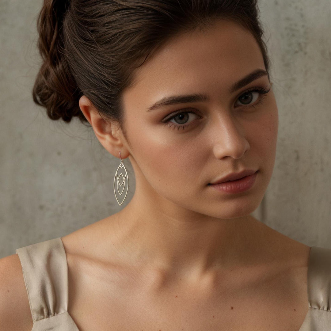 These beautifully detailed gold earrings feature a stylised art deco design made of solid brass which has mellowed in colour over time to a beautiful gold colour.