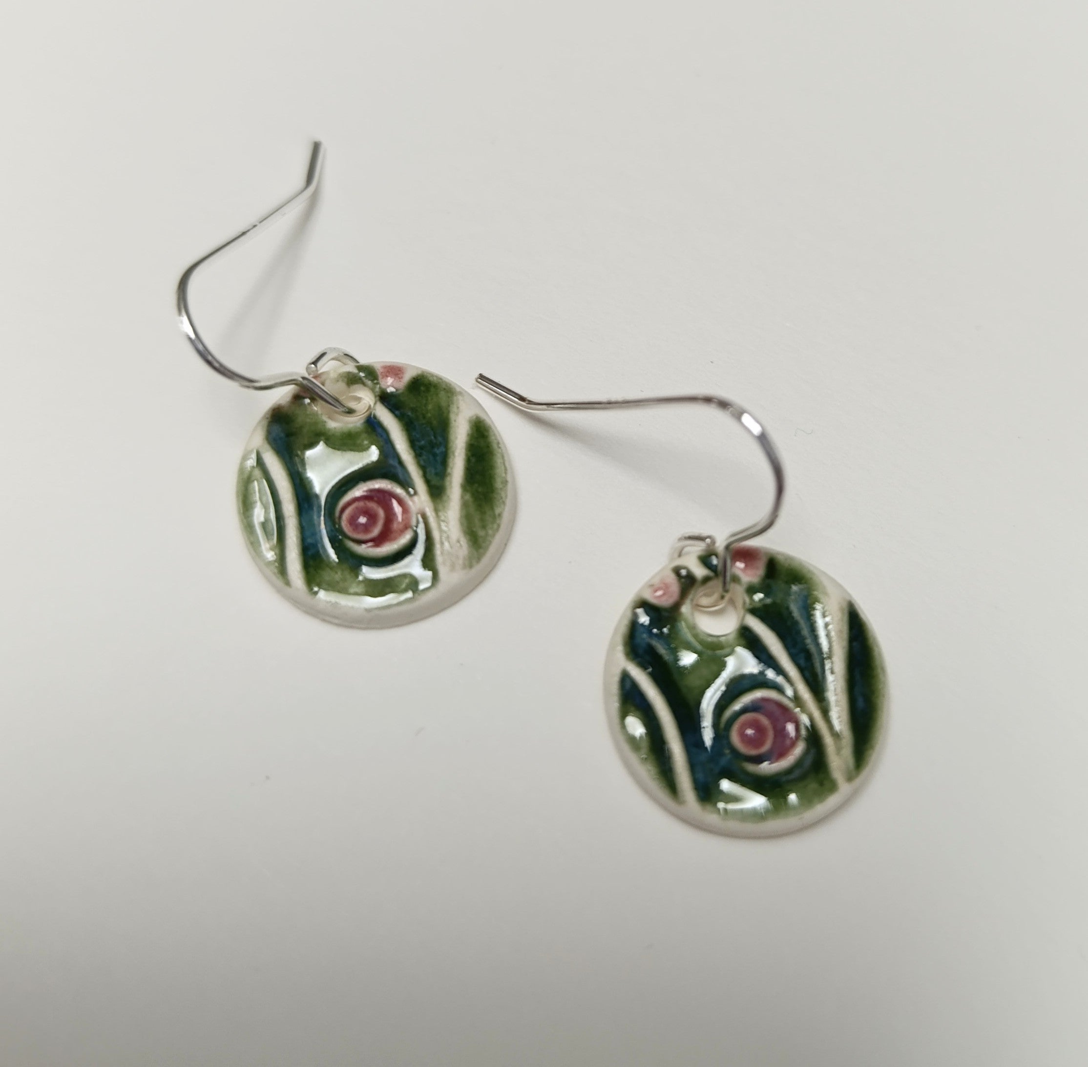 Ceramic circle drop earrings - white, green & pink abstract design