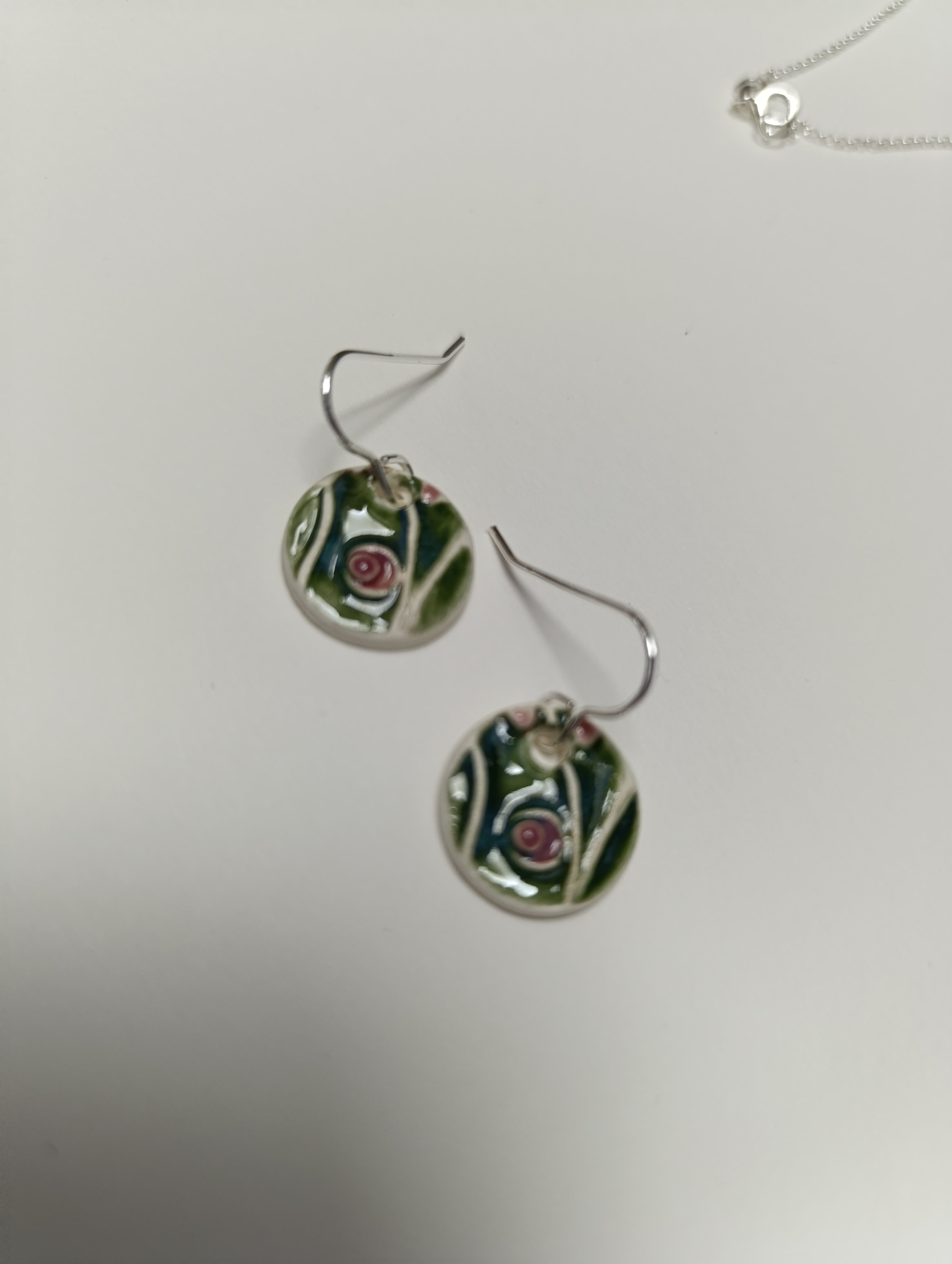 Gorgeous ceramic circle earrings with abstract design, on a sterling silver chain by Kilcreggan based Helen of Driftwood Harp.