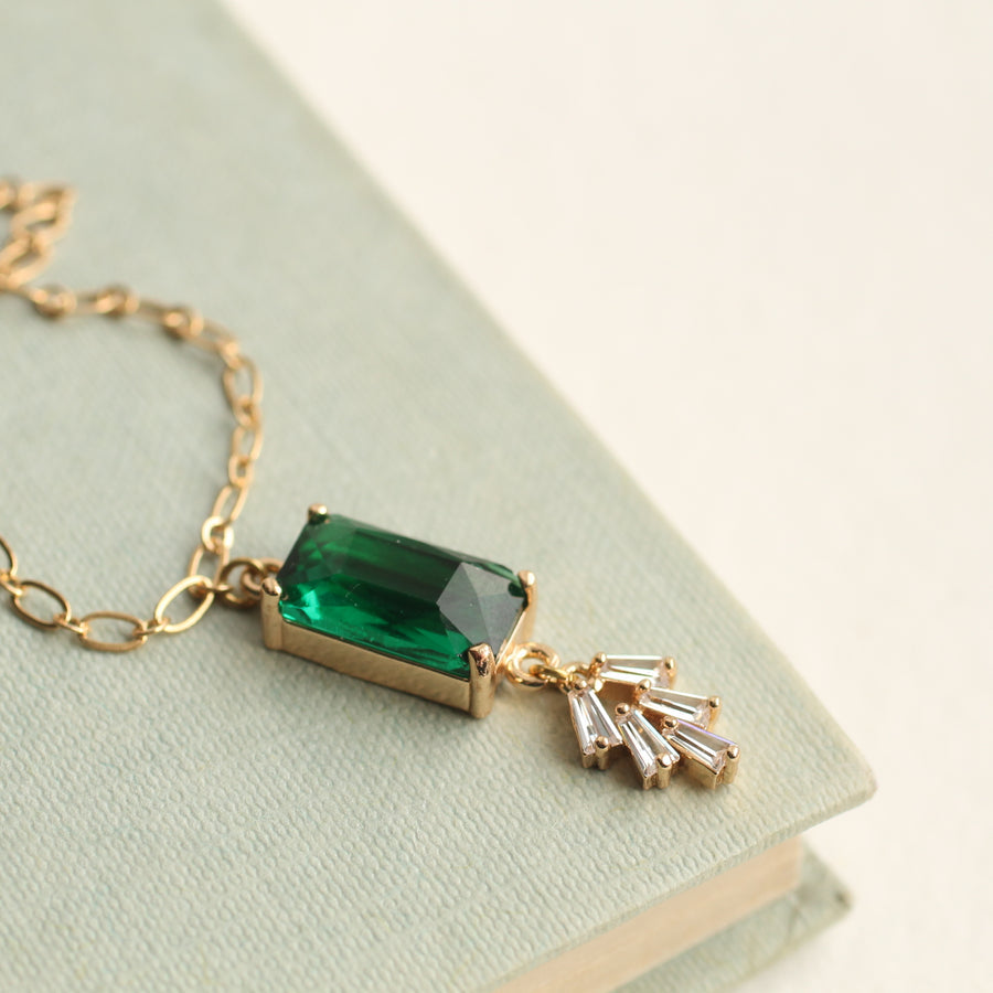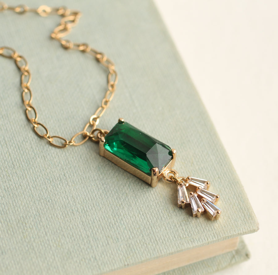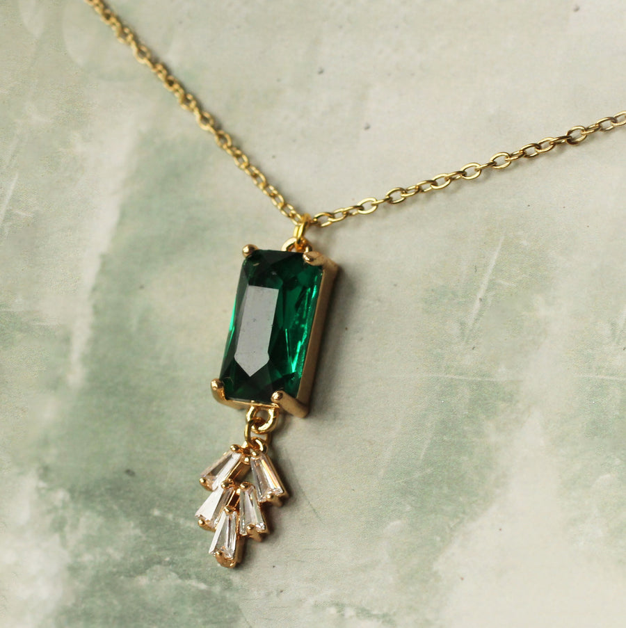 The rectangular baguette cut stone is glass in a beautiful, cool toned emerald green shade.