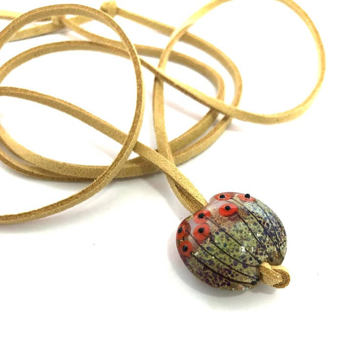 A beautiful pendant featuring abstract poppies on a glass bead laden with silver leaf and furnace glass, decorated on both sides. The glass bead is individually handmade in a blowtorch by Helen. Approx 21mm across, on a 1m cord which can be shortened to suit your desire. Cord is high quality faux suede, vegan and cruelty free and can be easily adjusted with scissors.