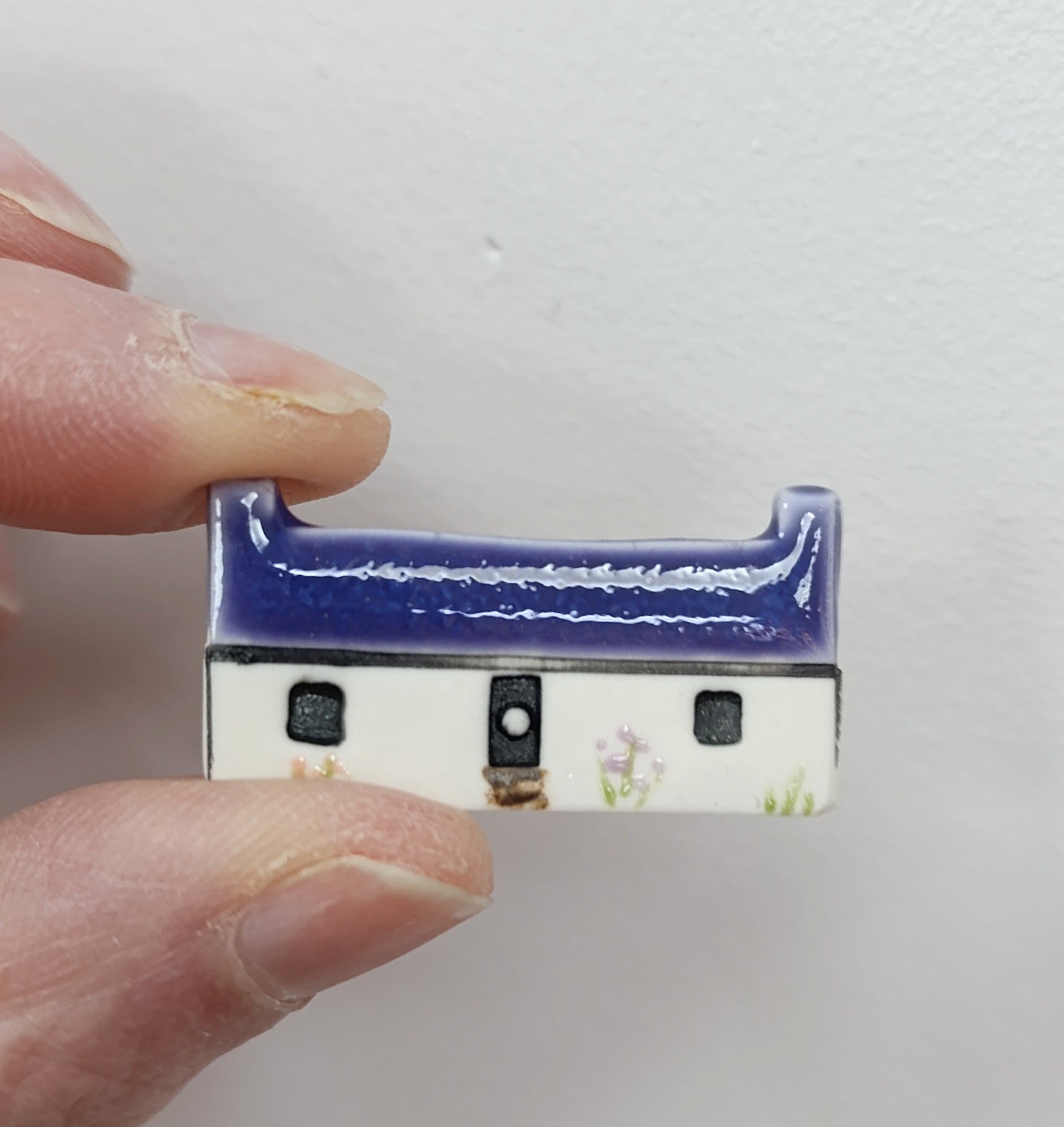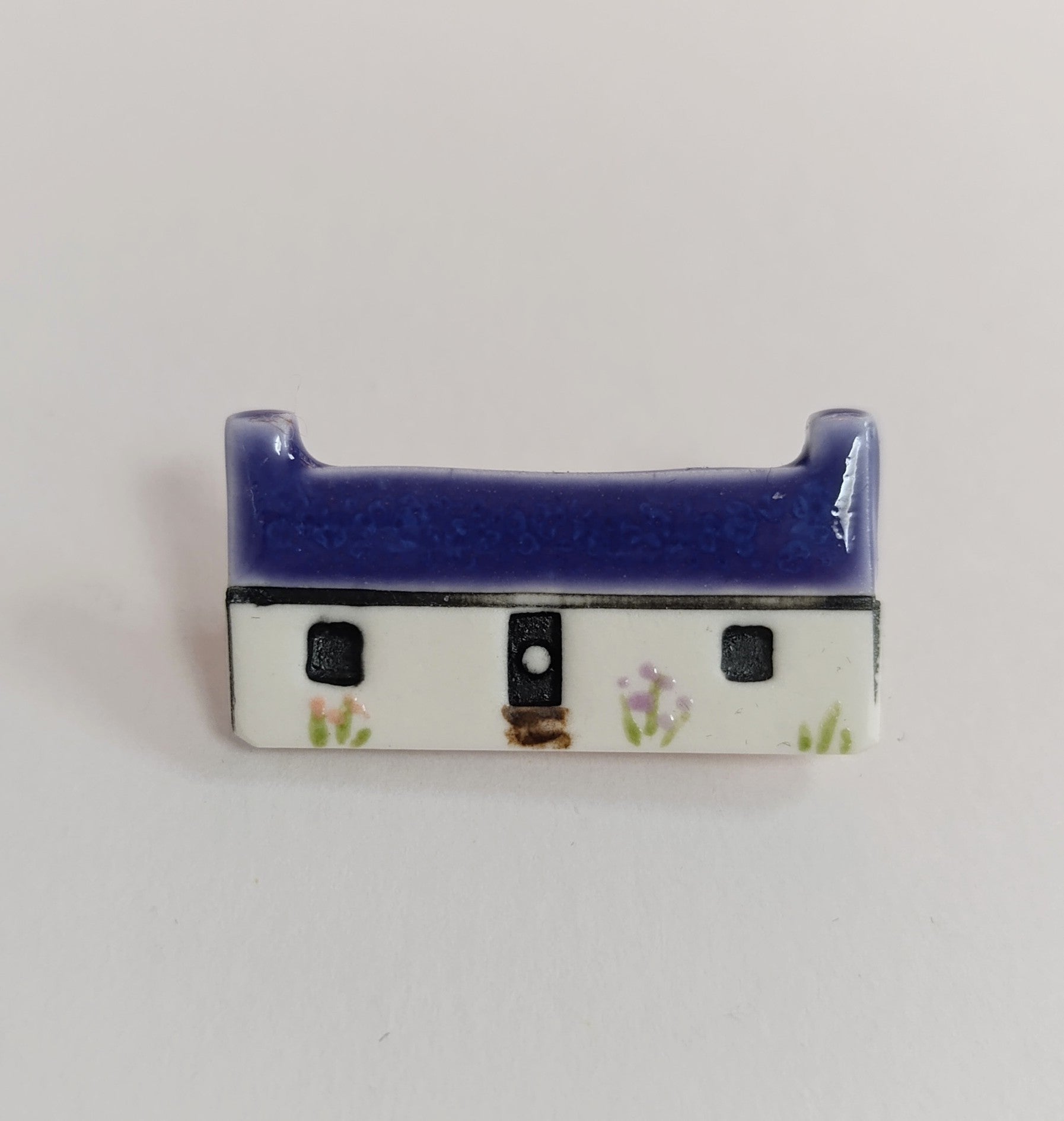 Gorgeous Scottish bothy ceramic brooch with a purple roof and pretty, hand painted flowers from Argyll based Helen of Driftwood Harp.