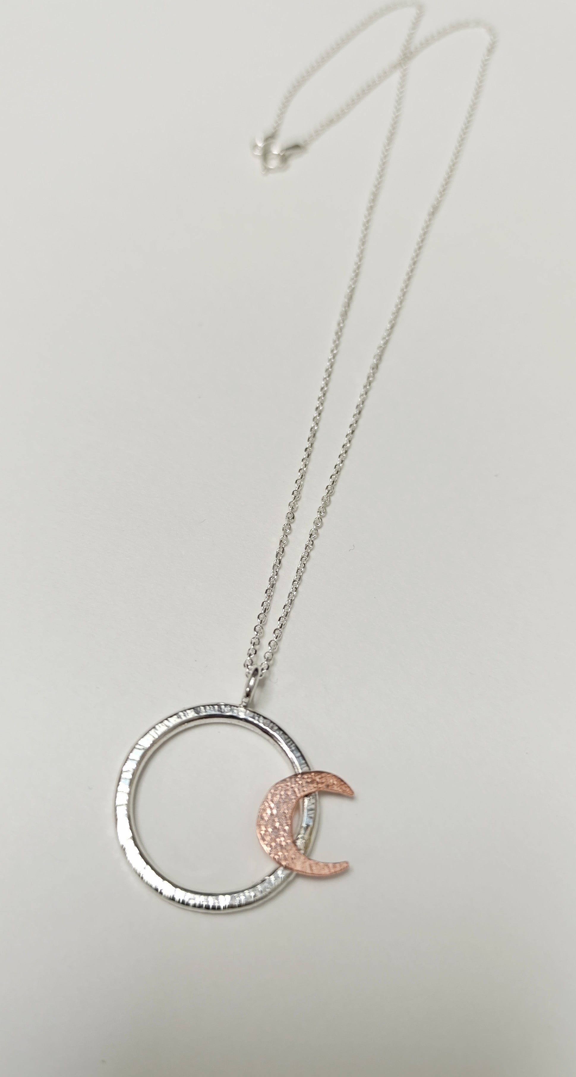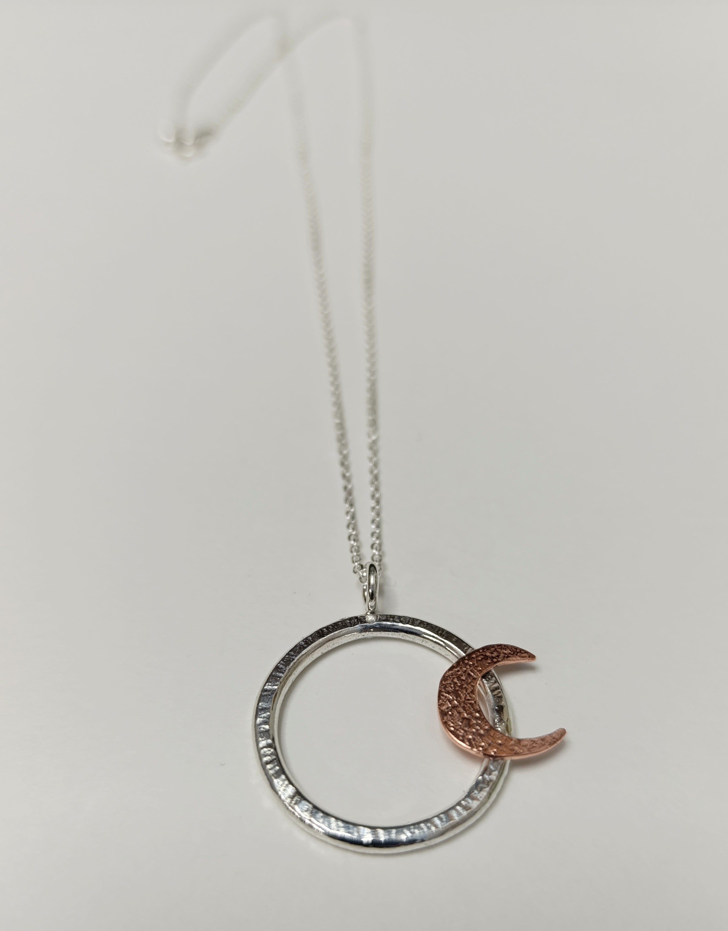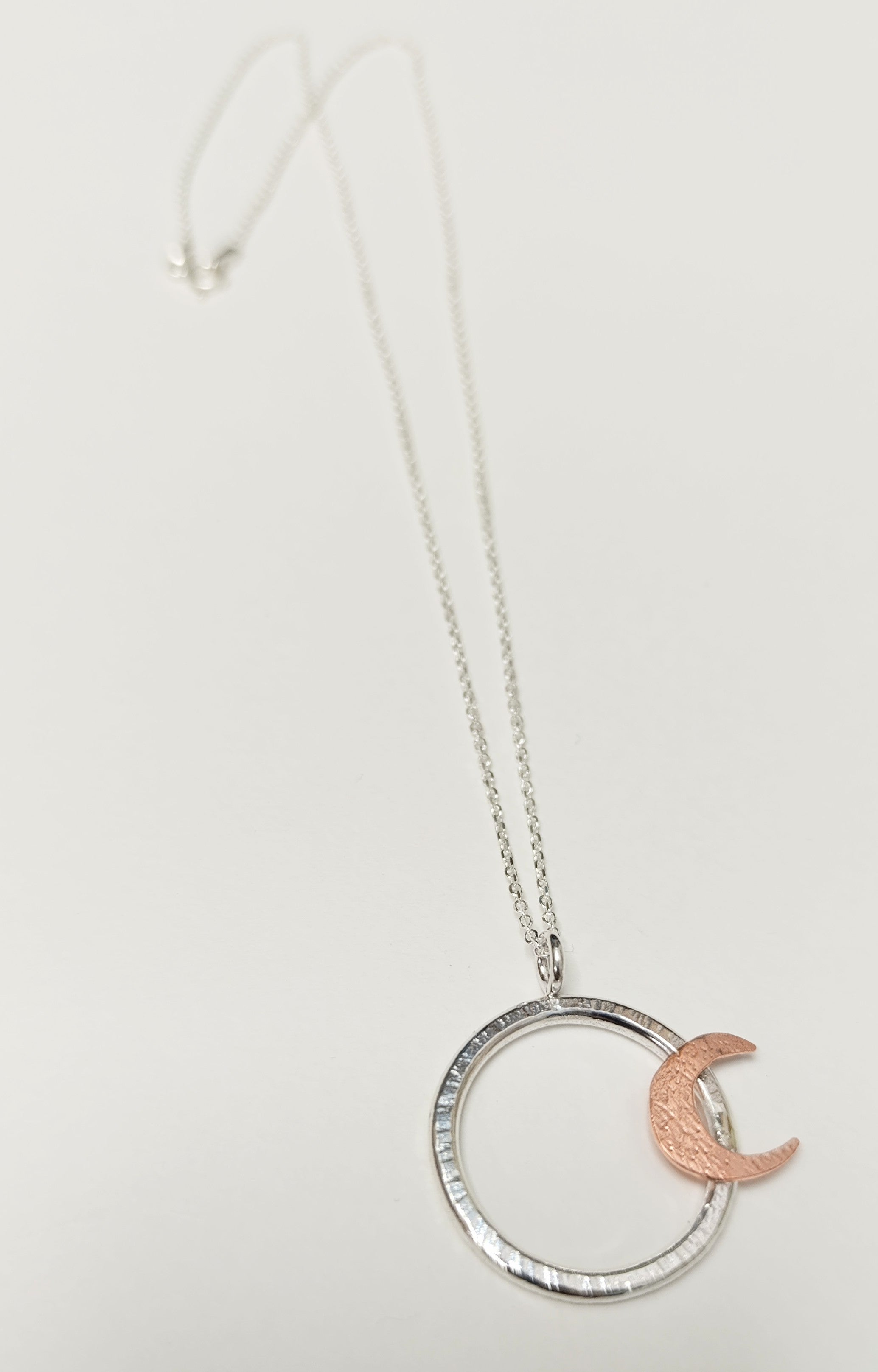 The pendant features a solid, sterling silver hoop a s a contrasting copper crescent moon. The different finishes on the silver and copper make the pendant sparkle and catch the light really prettily.