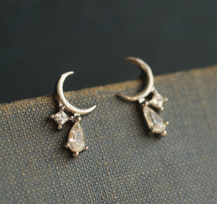 These charming stud earrings are Sterling Silver 925 and feature a crescent moon with tiny crystals accenting the earring.