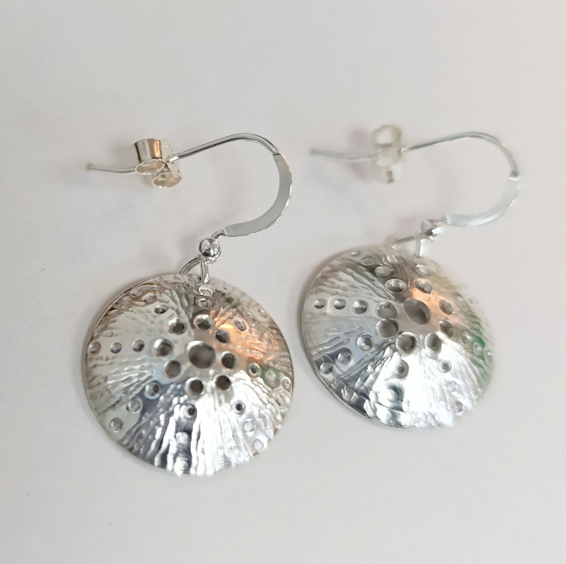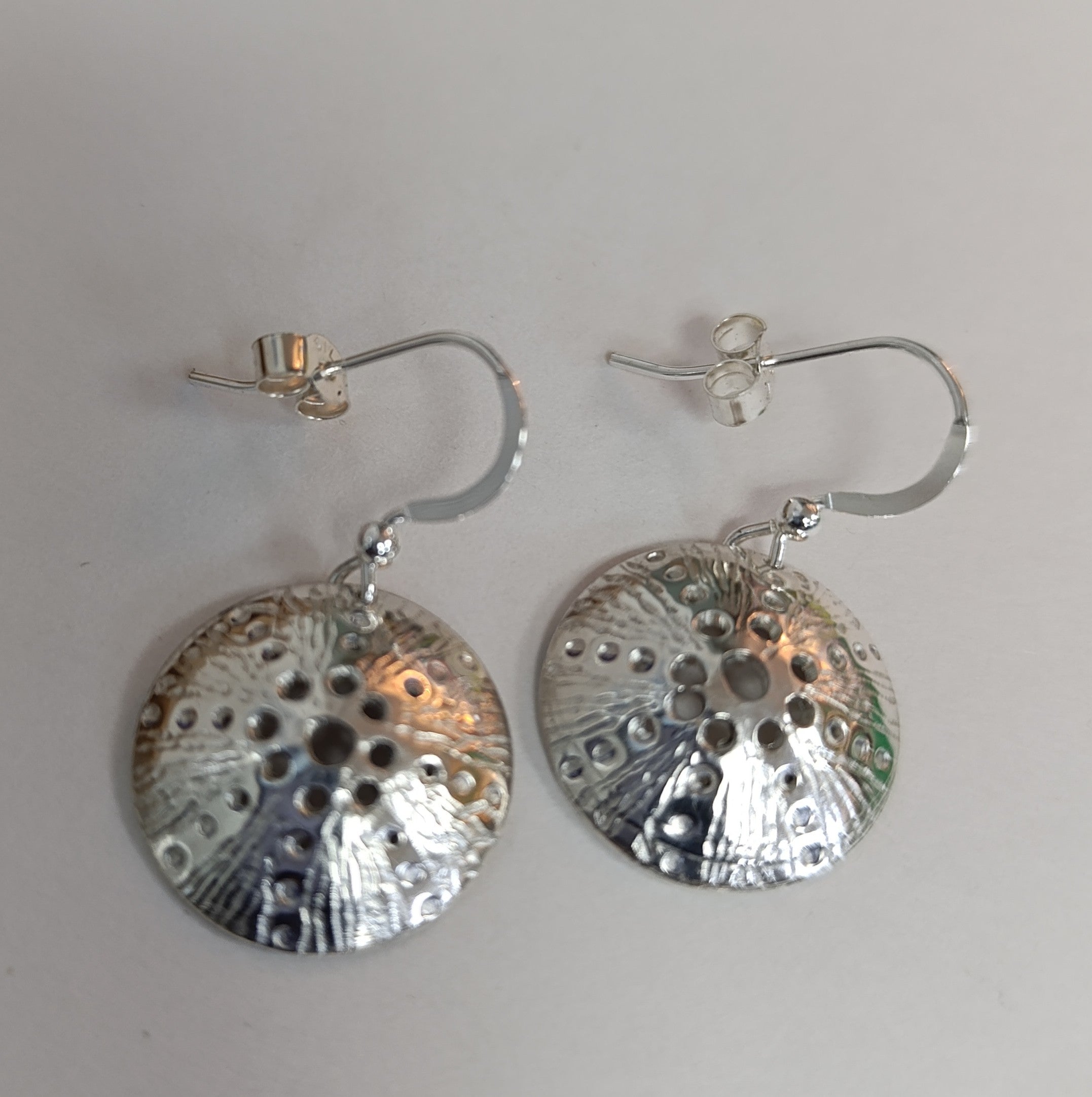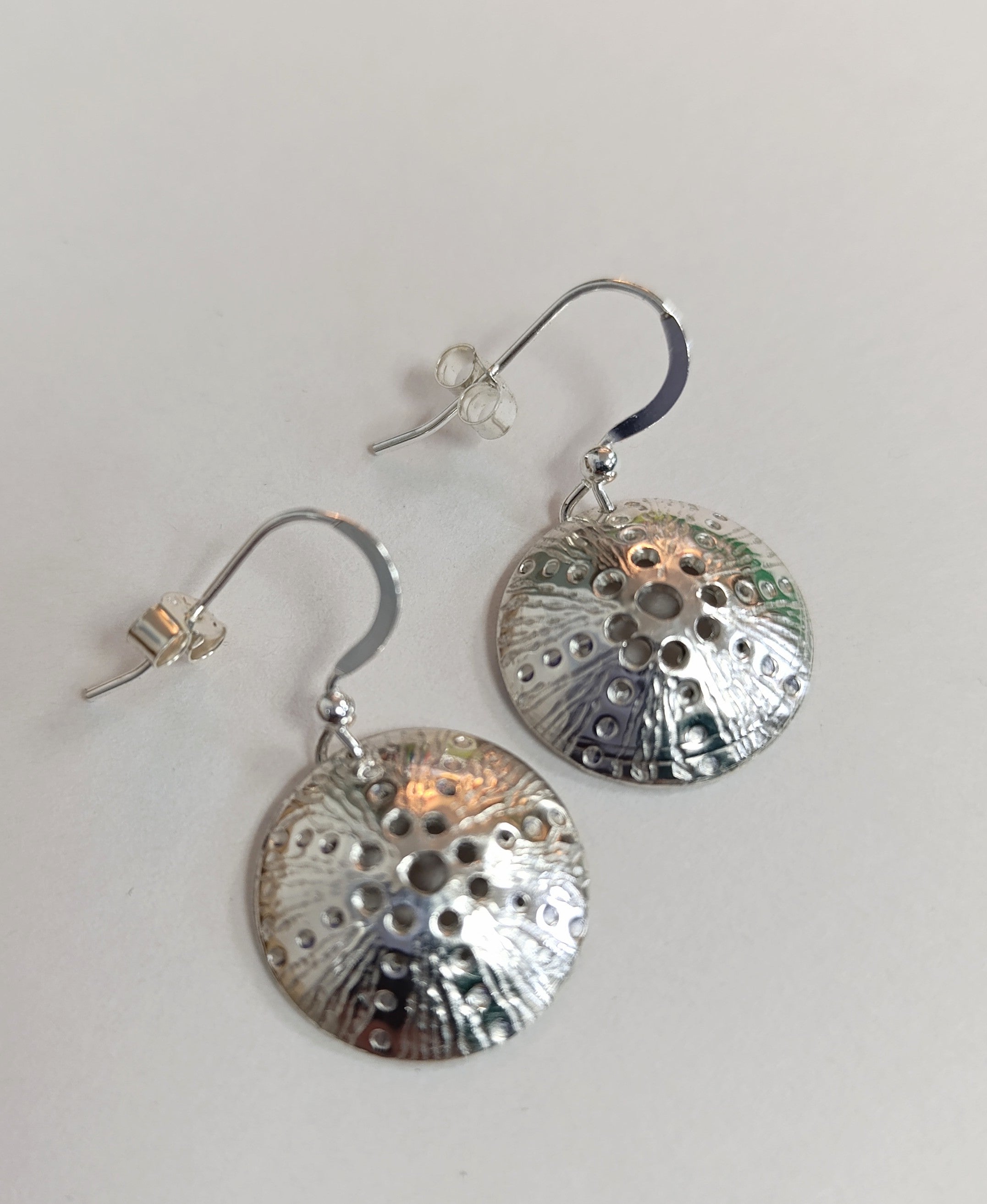 The earrings hace been punched and engraved to give the appearance of the outside of a sea urchin.