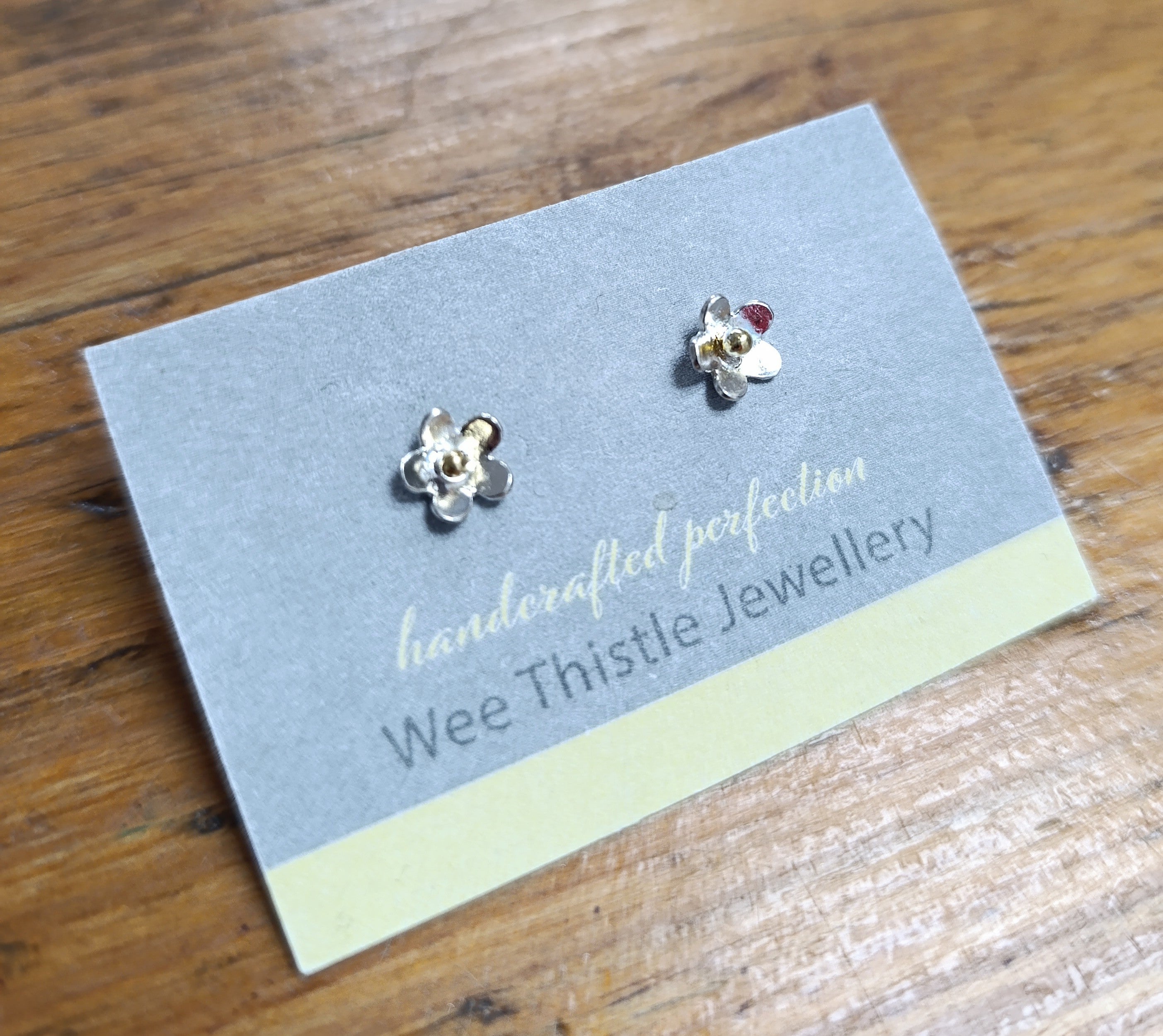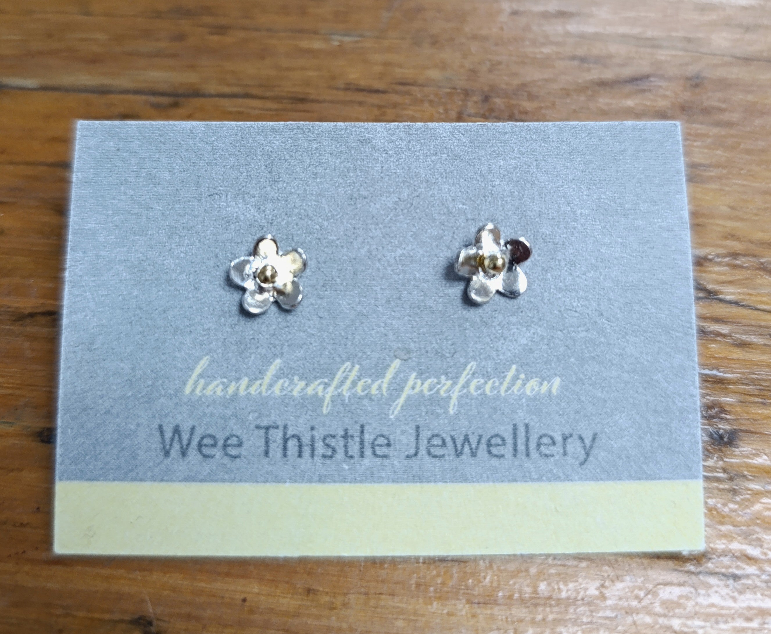 Beautiful sterling silver flower studs with 24k gold old centre from local, Glasgow based jeweller, Sarah of Wee Thistle Jewellery.