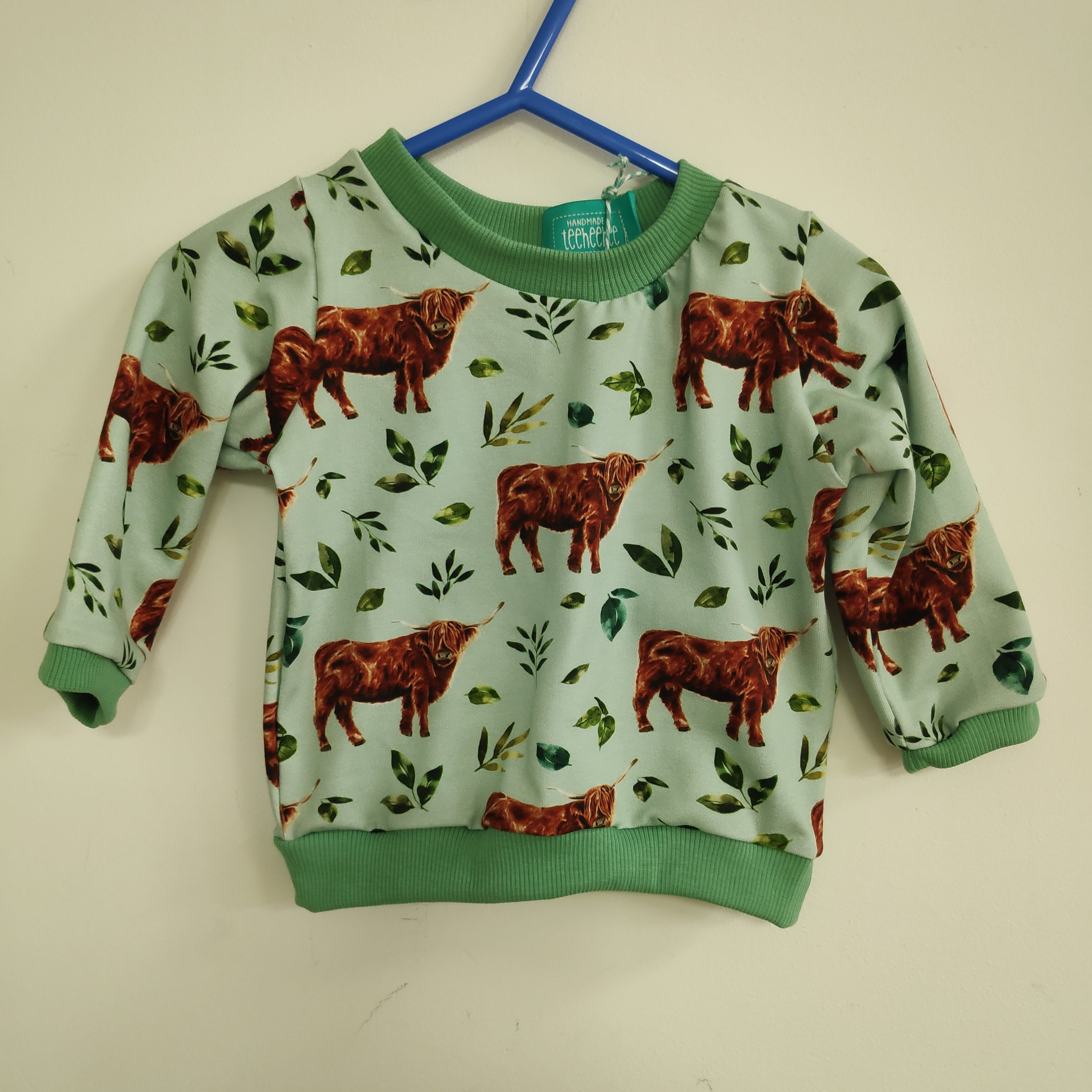 Long sleeved baby/child t-shirt - Highland Cows on mint background (0-6 months or 6-12 months)