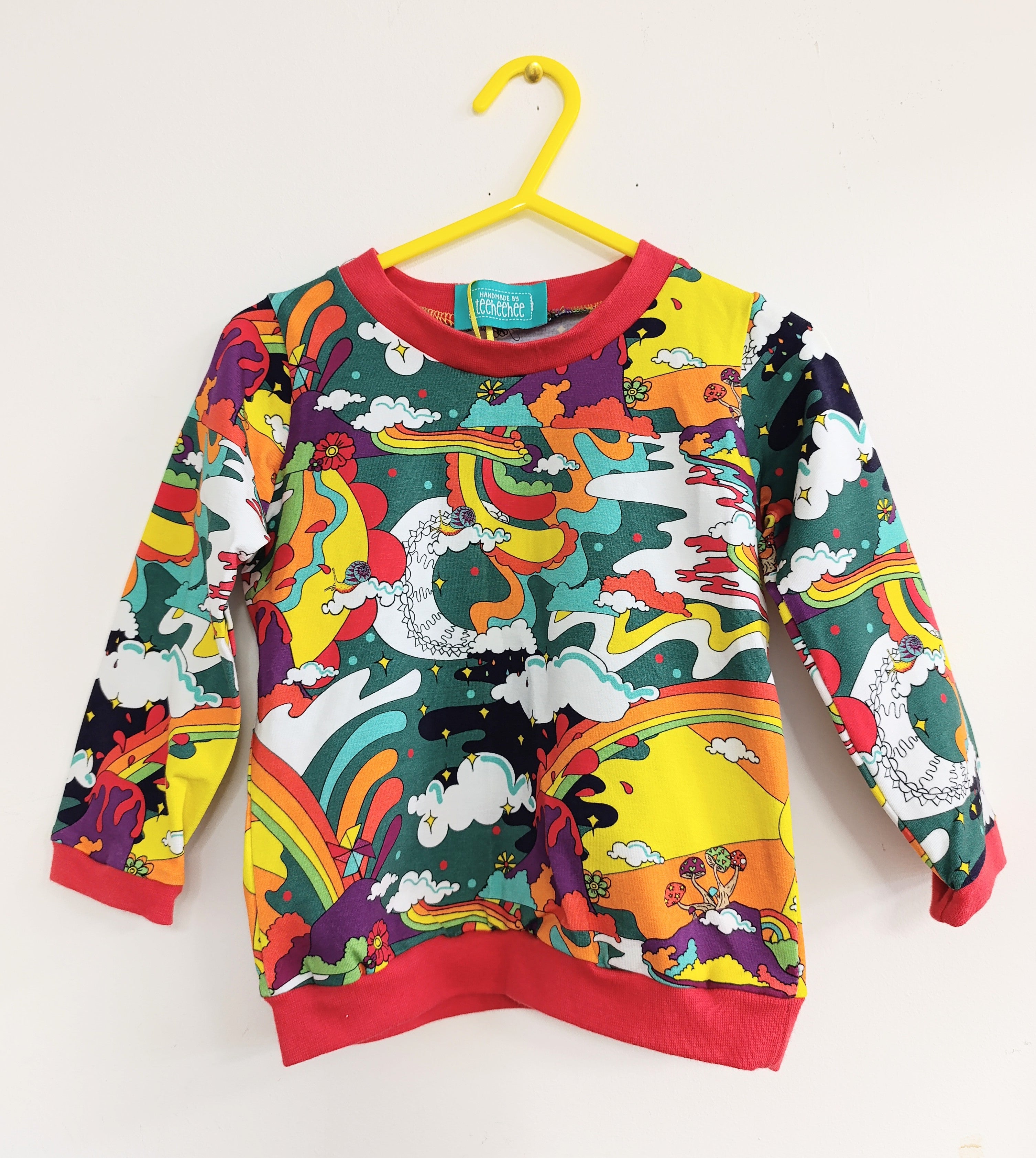 Super funky long sleeved t-shirt in jersey cotton with ribbed cuffs and bottom from local maker, Vic of Handmade by TeeHeeHee.