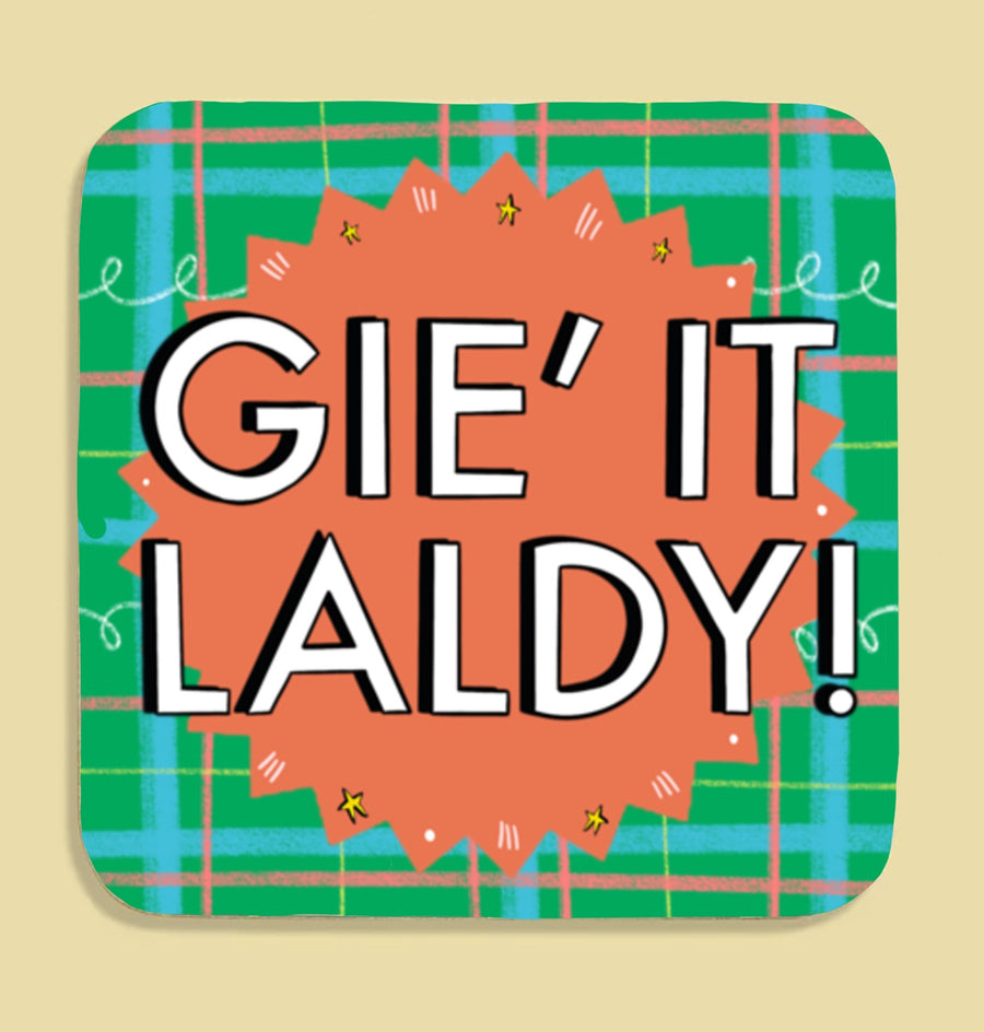 Funky Gie It Laldy coaster featuring a Claire Barclay Draws illustration.