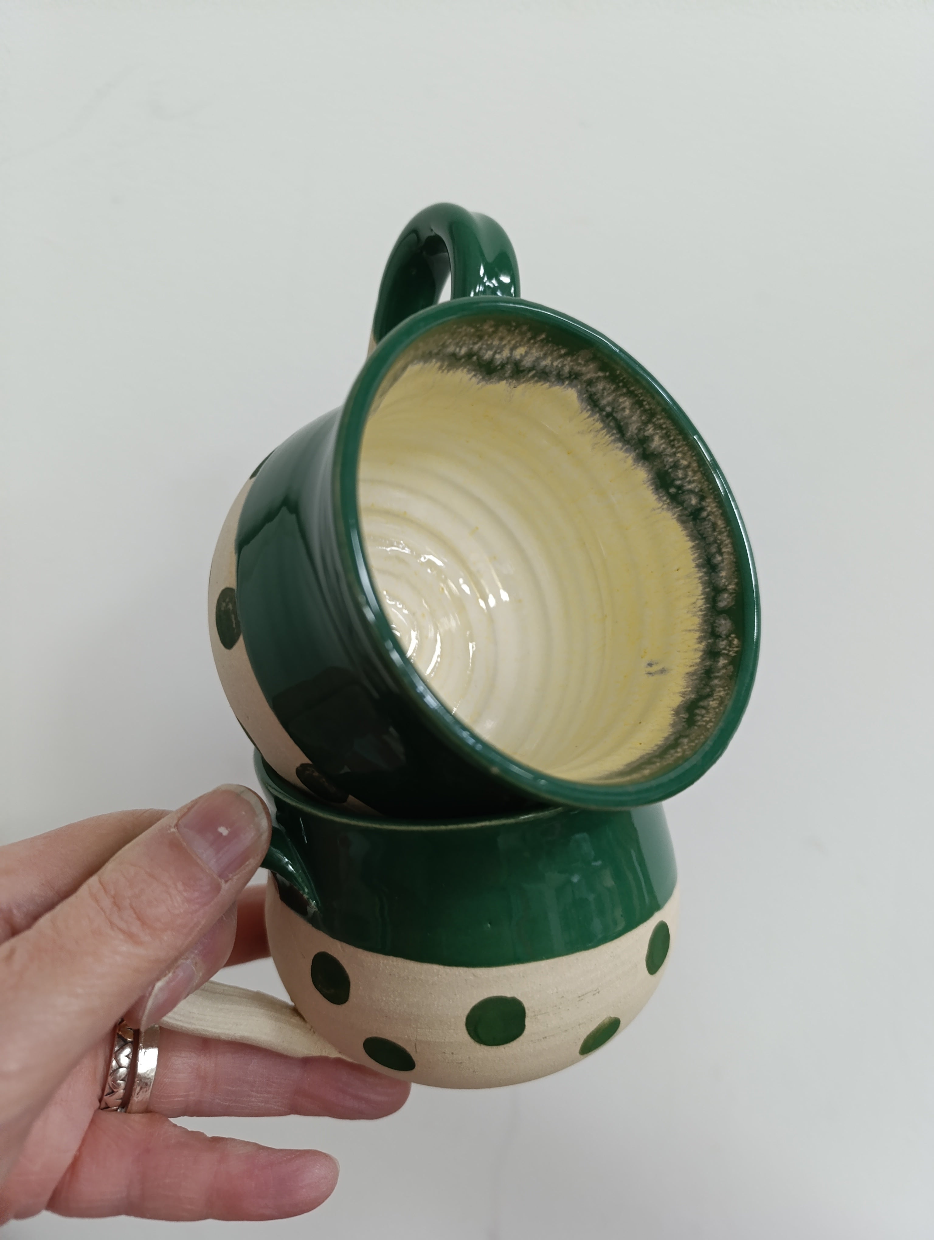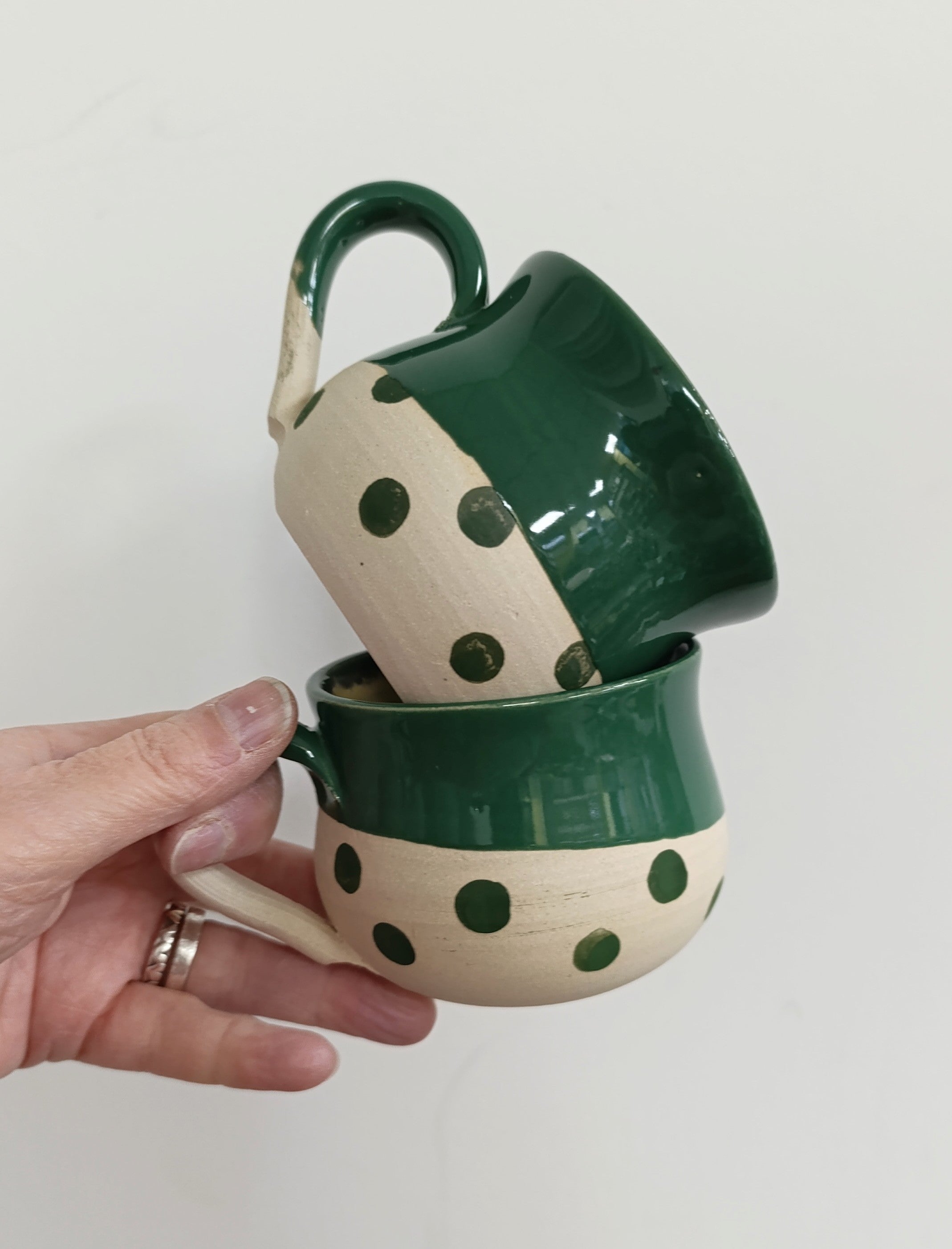 Hand thrown fun spotty green mug from Old Rossland Pottery.