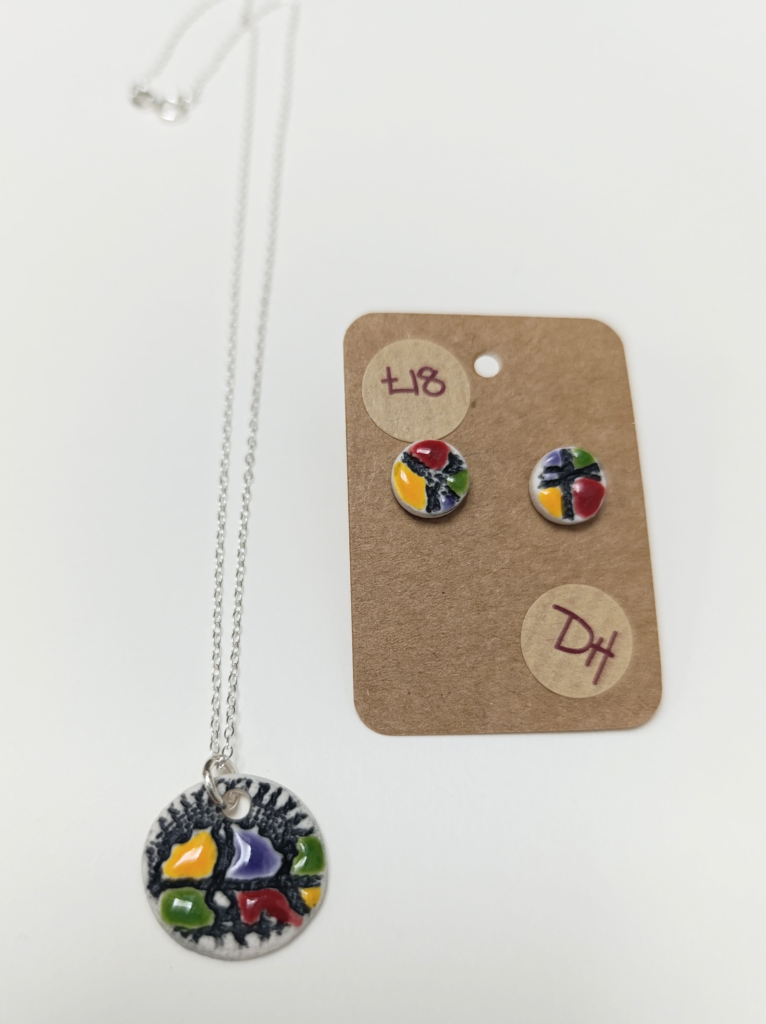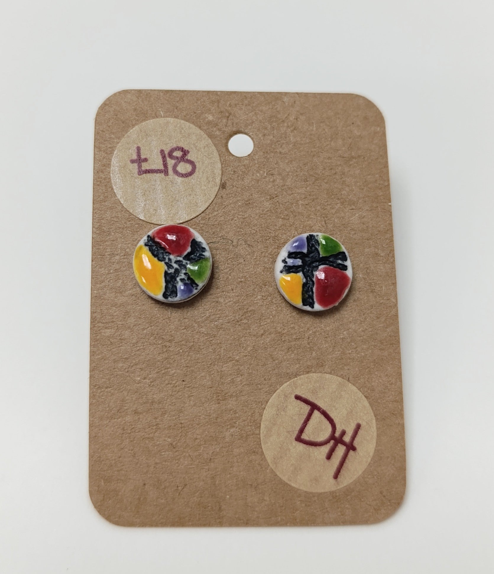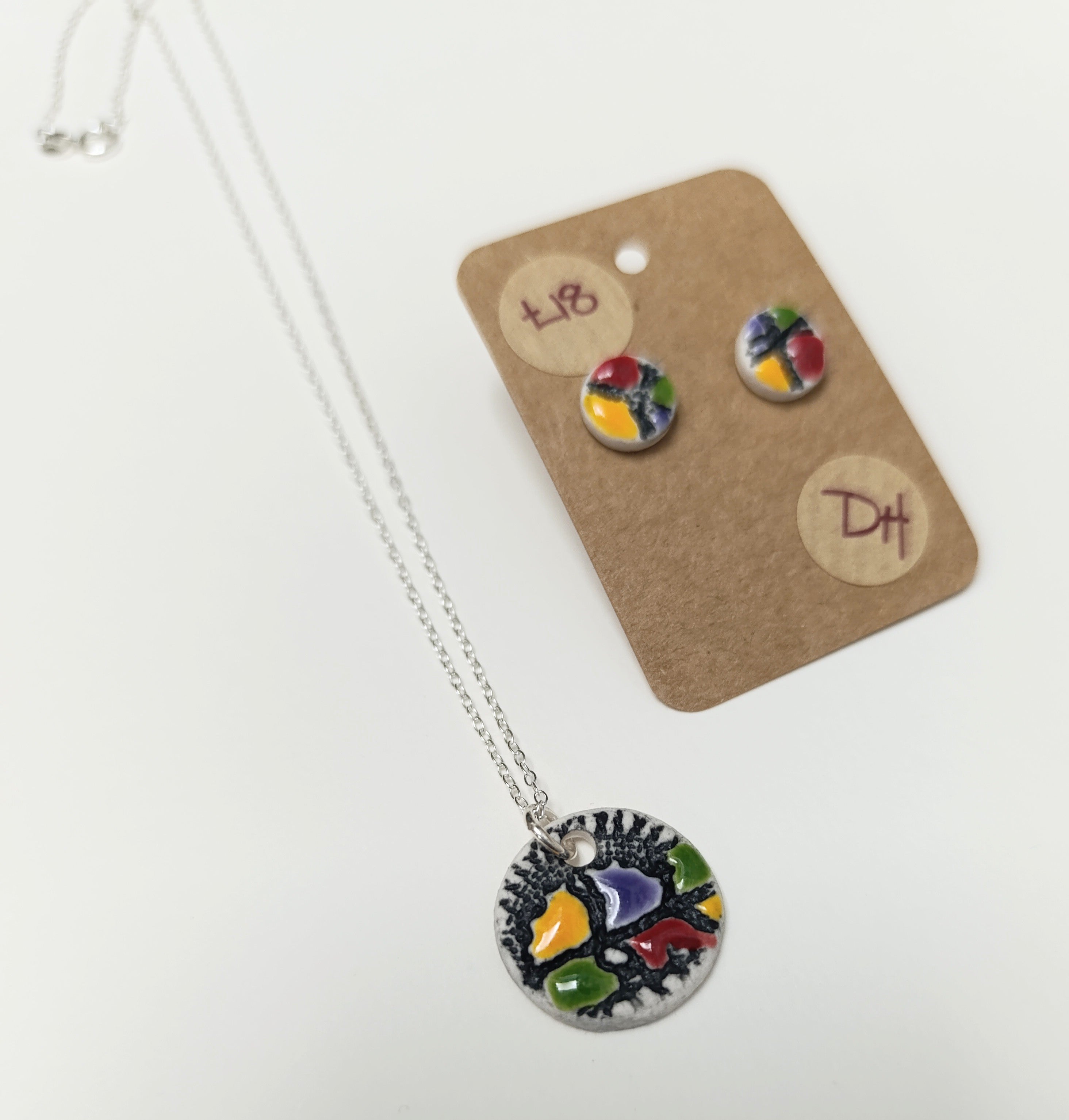 Round ceramic stud earrings, imprinted with lace and colourfully glazed from Kilcreggan based Helen of Driftwood Harp.