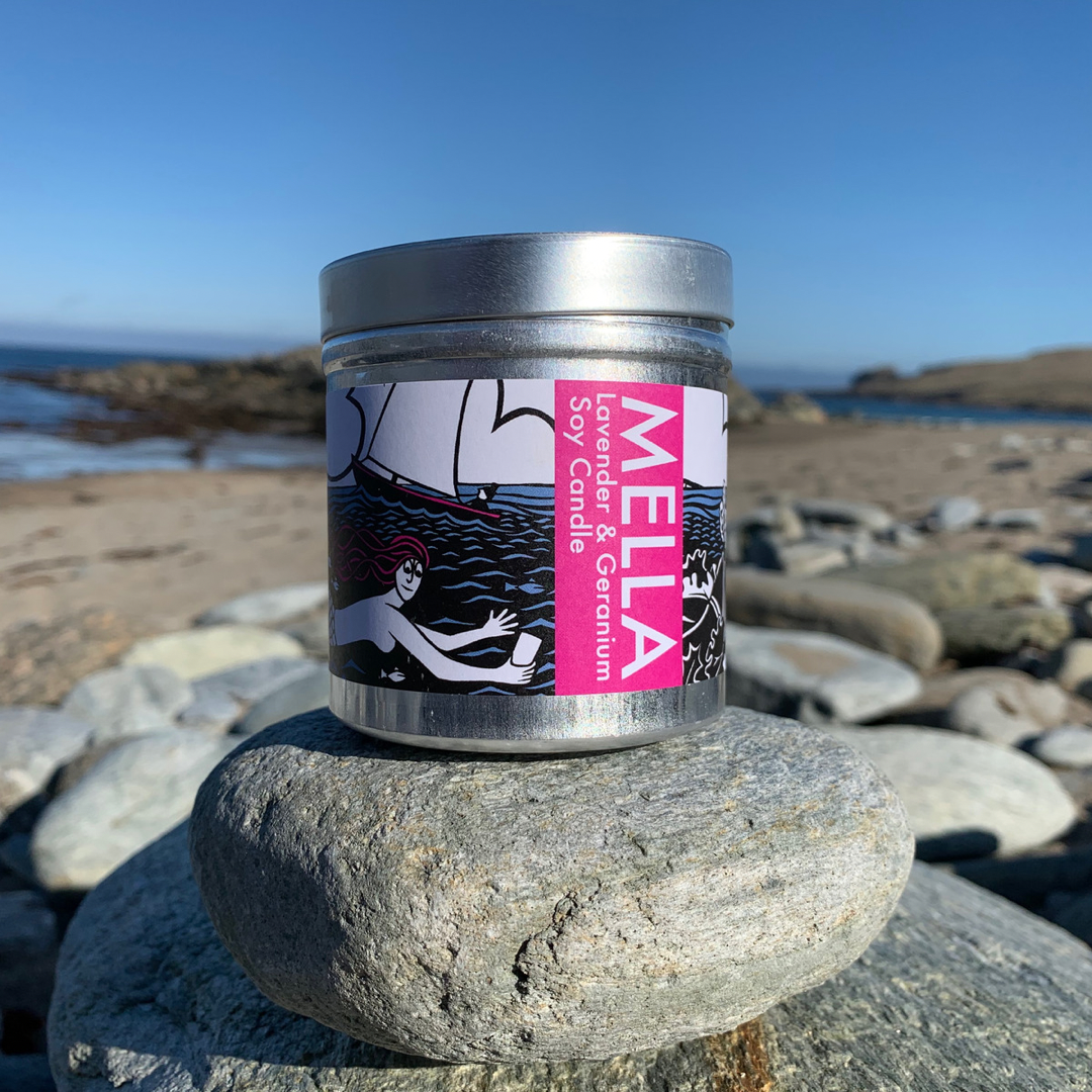 Natural wax candle handcrafted by Mella Soaps on Shetland! Scented with the finest fragrance oils of lavender and geranium. In a aluminium tin with lid, with a gorgeous illustrated label. Fully recyclable.