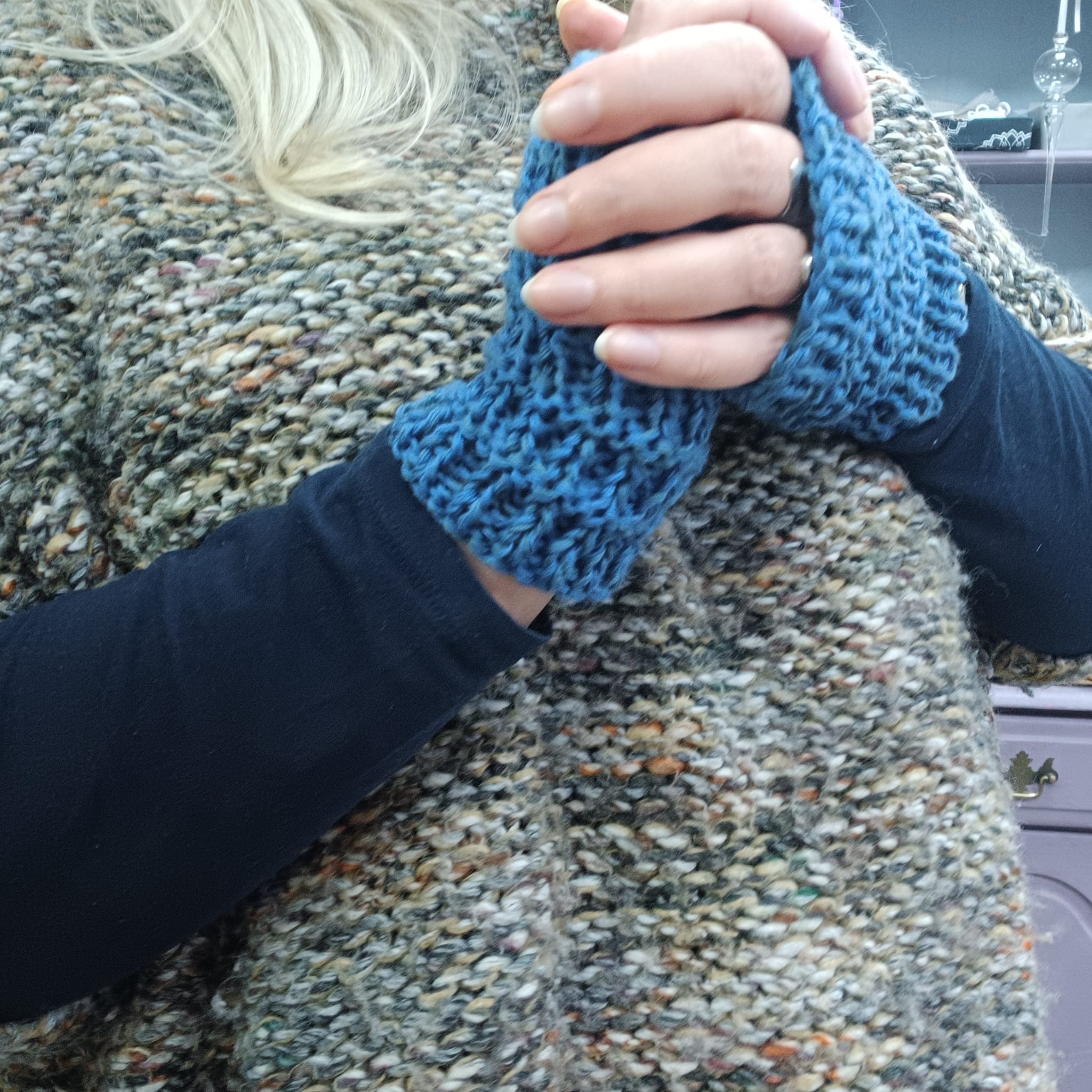 Hand knitted by Clare these fingerless gloves are inspired by the Templeton's building on the Glasgow Green. This design is based on the brickwork.