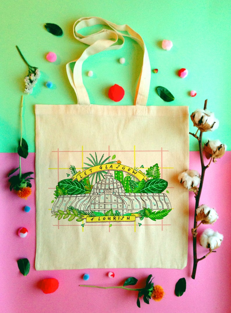 'Let Glasgow Flourish' illustrated tote bag, super fun quirky design celebrating the beautiful green place that is Glasgow! From local artist, Claire Barclay Draws
