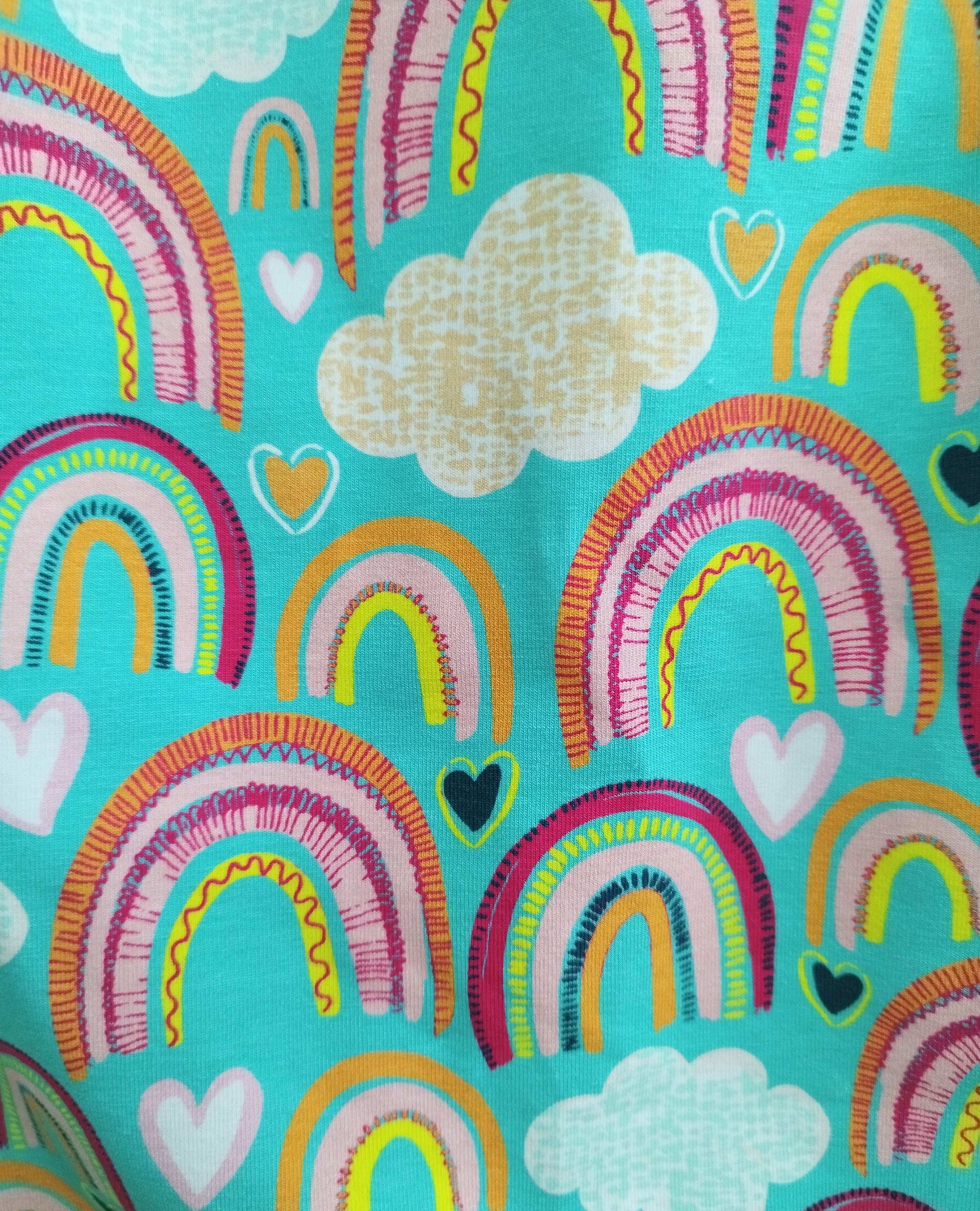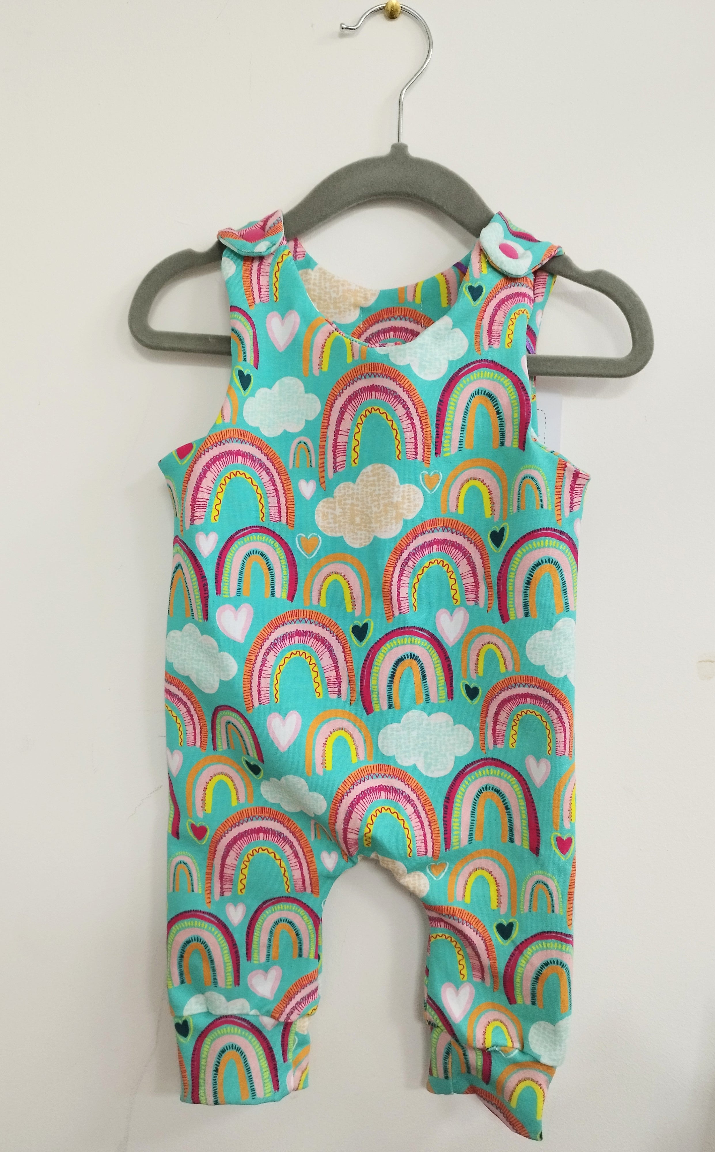 Toddler romper in a gorgeous rainbow and heart print, made right here in Mount Florida by Vic of Handmade by TeeHeeHee!