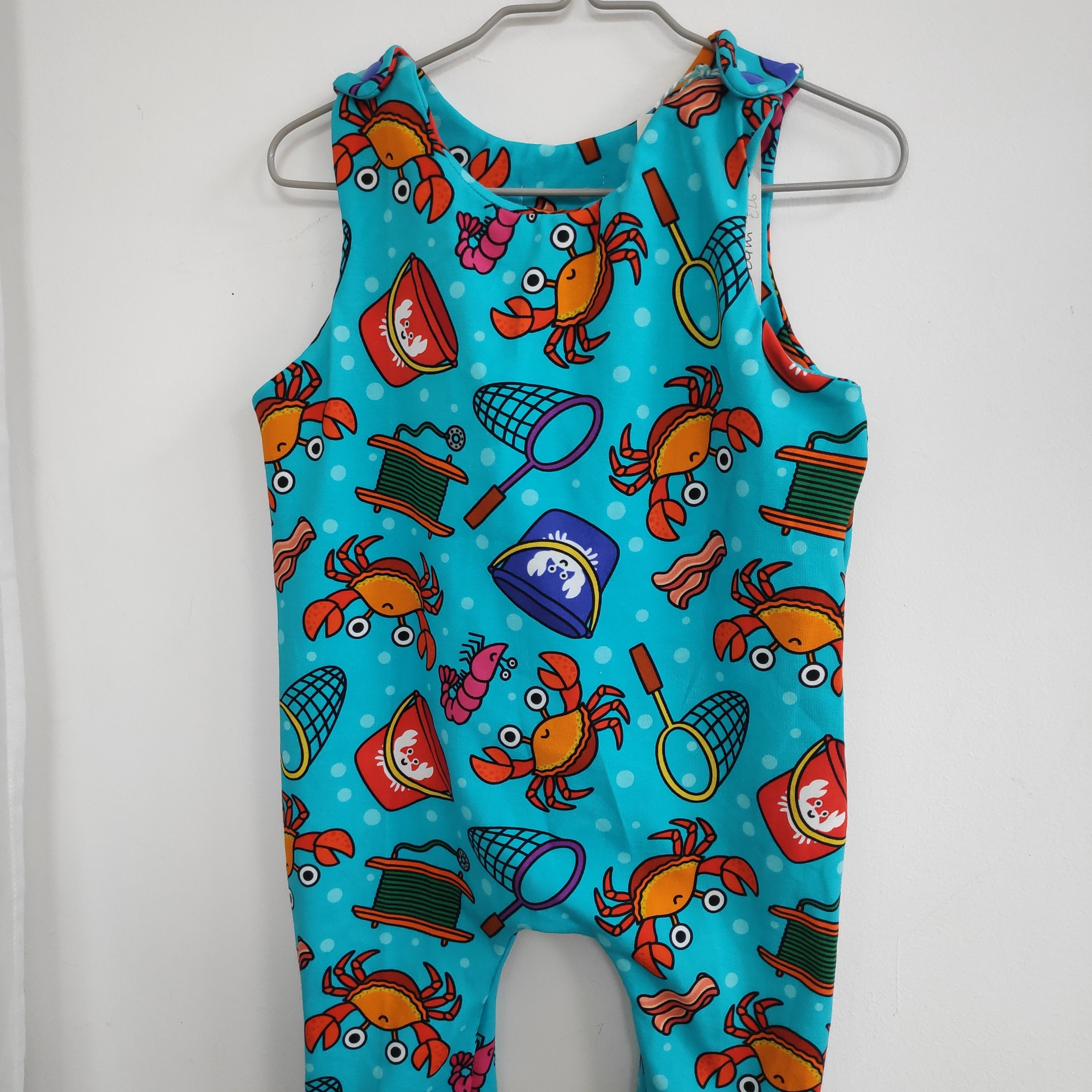 Baby romper in a fun crab fabric, made right here in Mount Florida by Vic of Handmade by TeeHeeHee!
