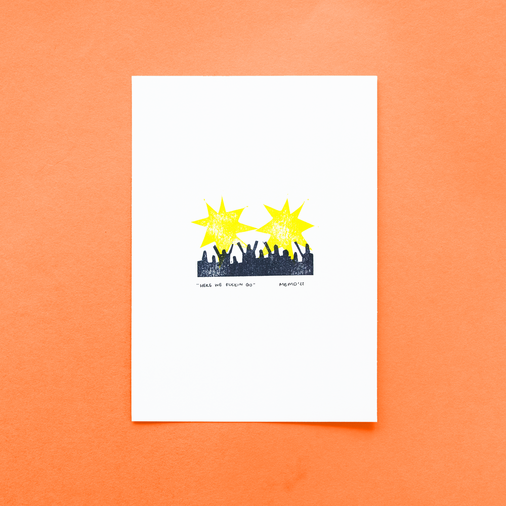 Here We F*ckin Go A5 linocut print