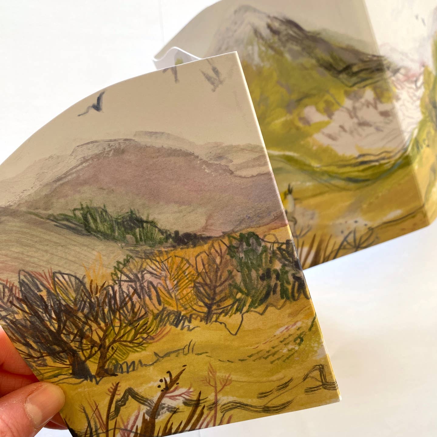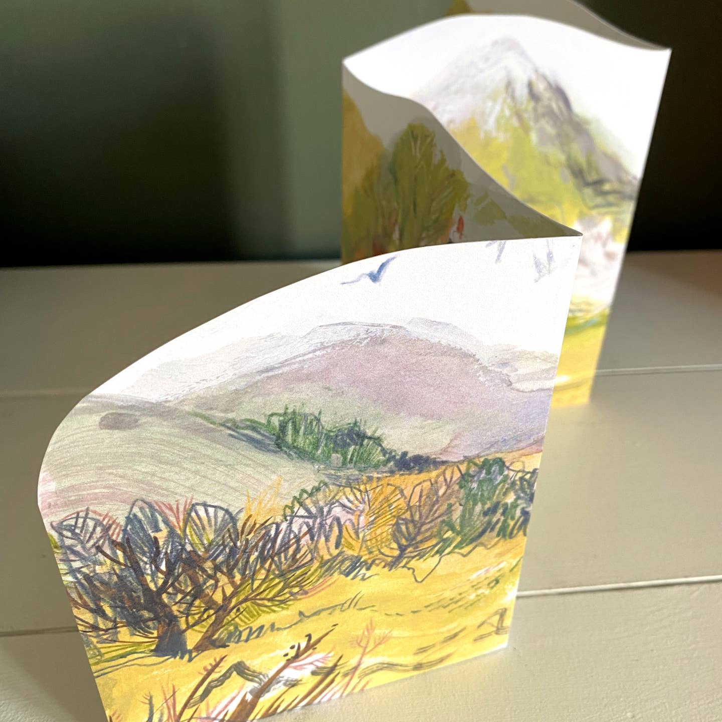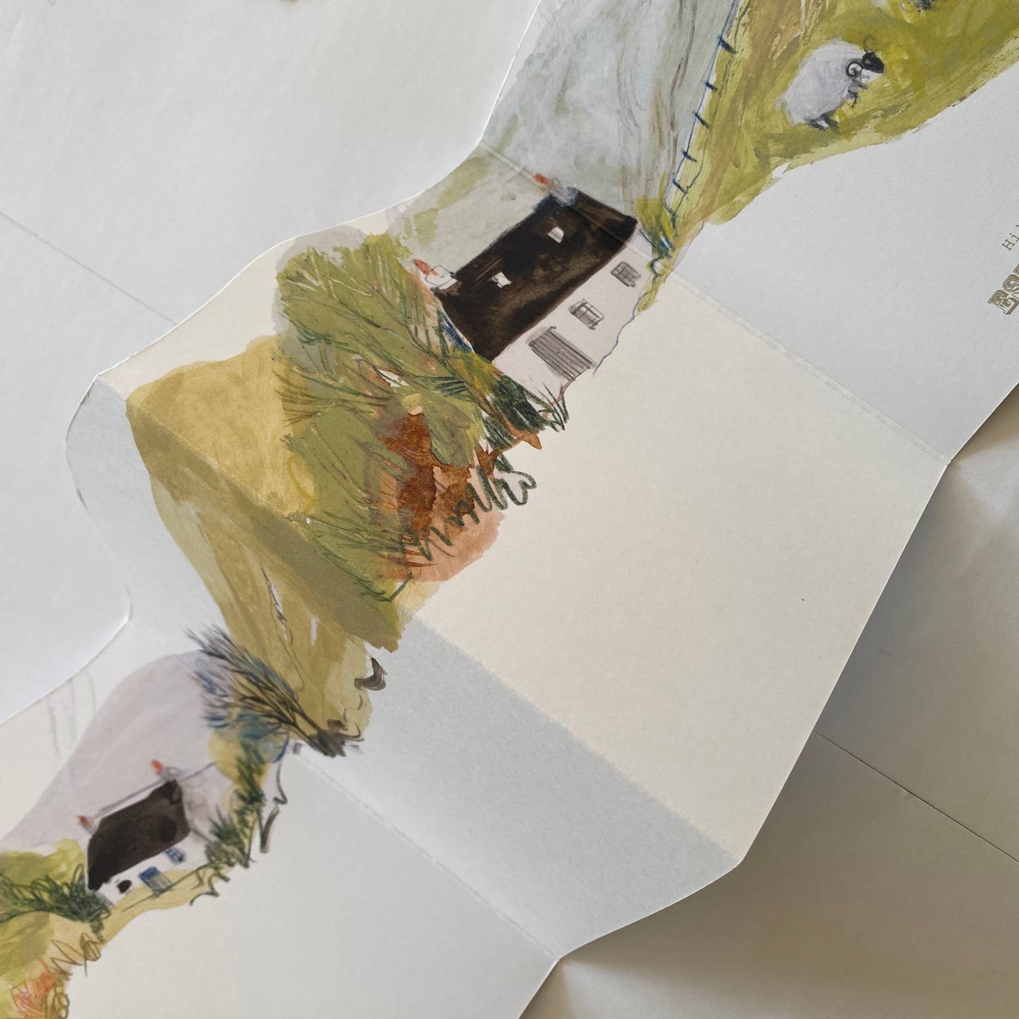 Inspired by the late Winter colours of the folds of hills in the Perthshire landscape, this fold-out concertina card shows a hilly scene on one side and a couple of painted cottages and grazing sheep on the other.