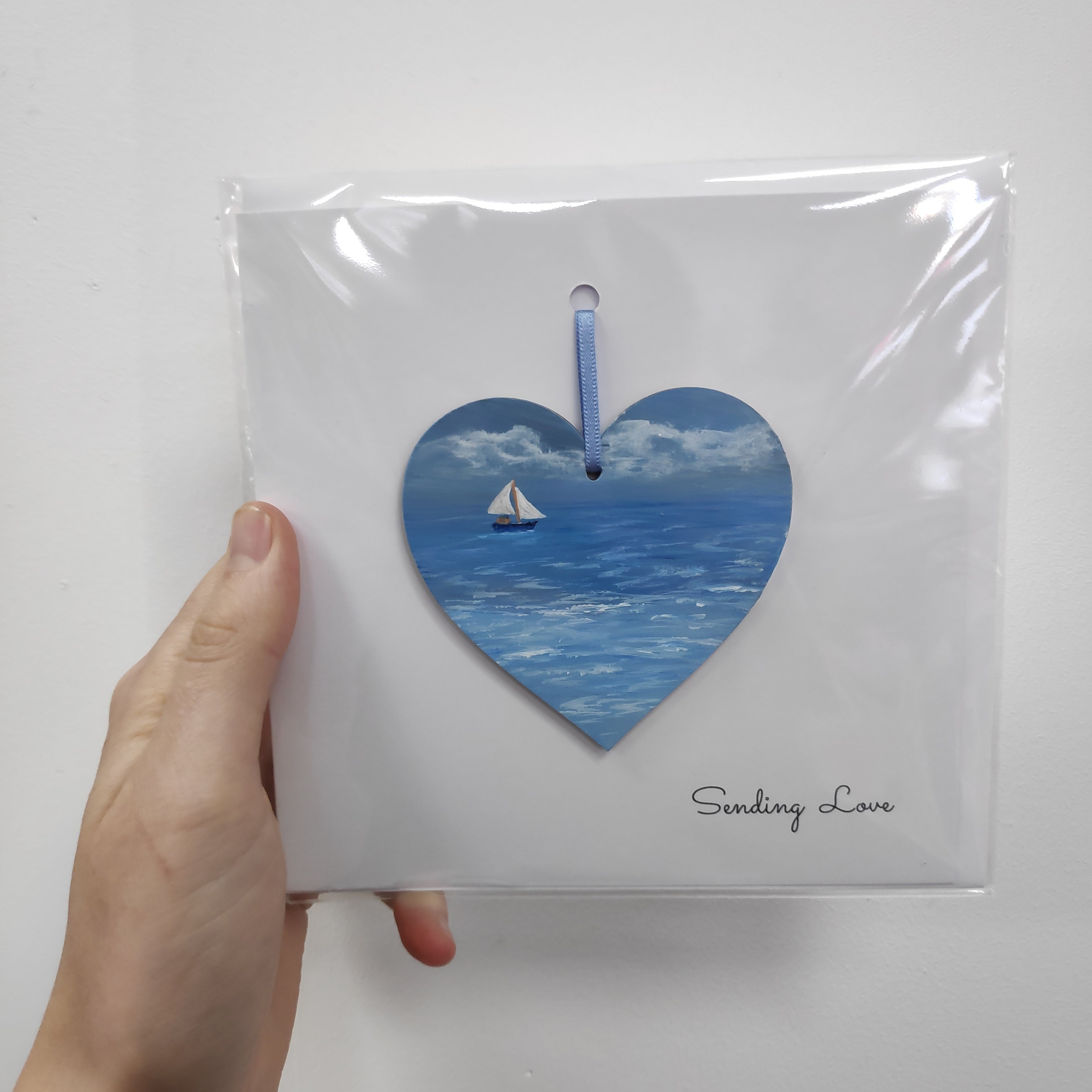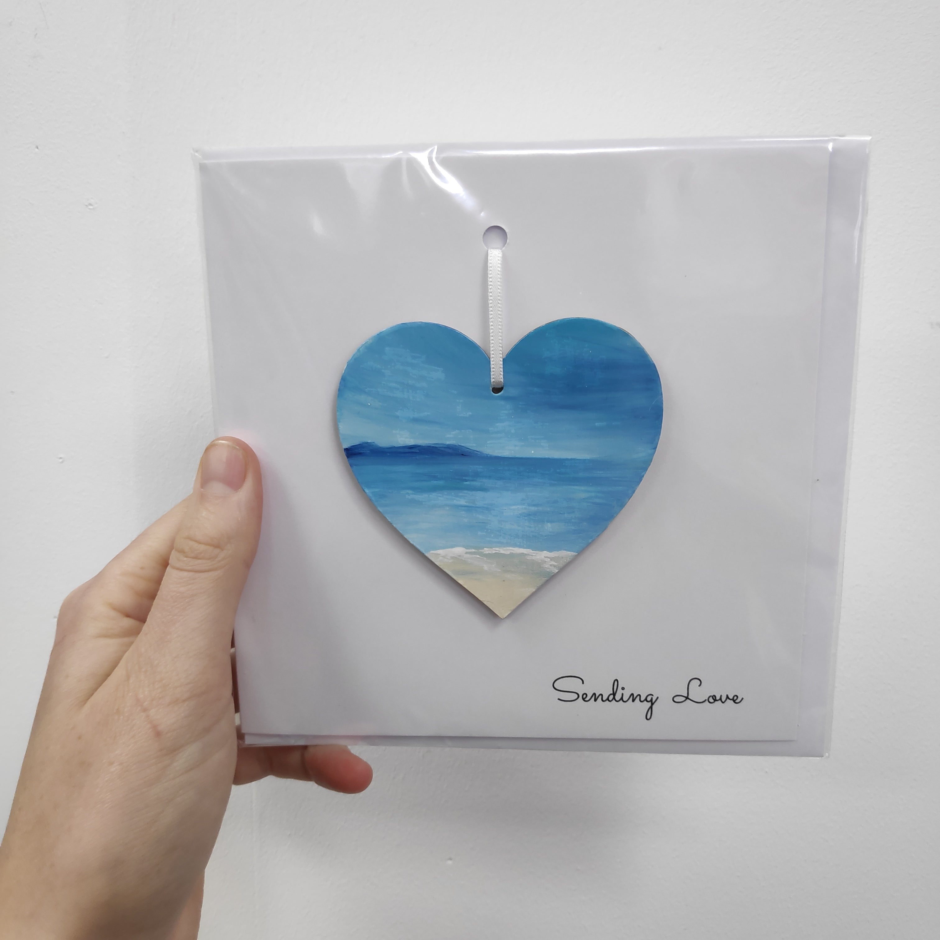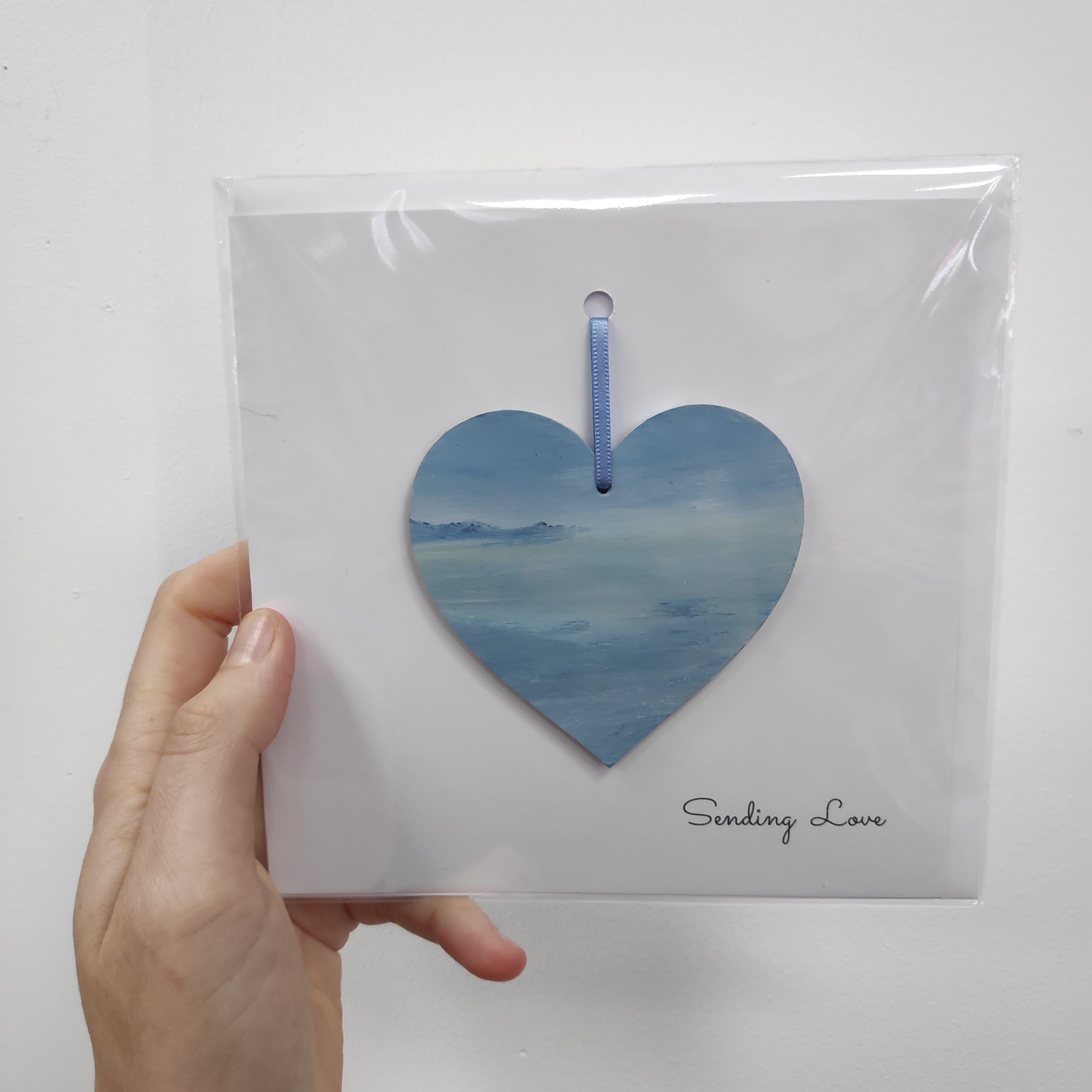 Sending love greeting card with ready to hang heart, card blank inside.