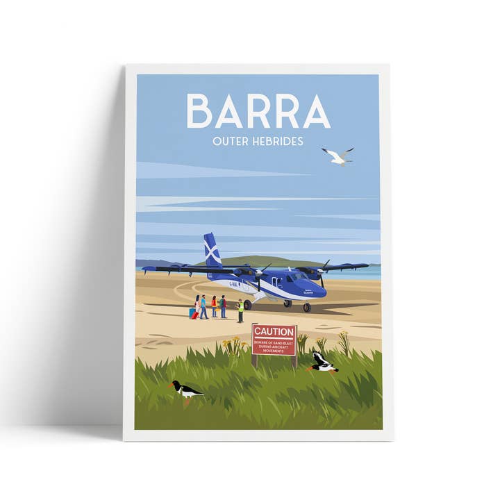 Capture the magic of Scotland’s most unique airport with this illustrated Barra travel poster, featuring the iconic Twin Otter plane landing on the beach at Traigh Mhòr — the only airport in the world where scheduled flights use the sand as a runway. Set against the backdrop of the Outer Hebrides, this artwork brings the wild beauty and adventure of island life to your walls. Perfect for lovers of Scottish islands, aviation enthusiasts, and travellers seeking a reminder of the Outer Hebrides’ charm.