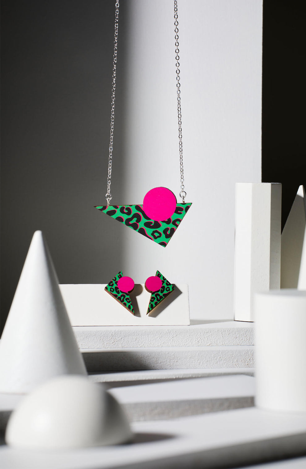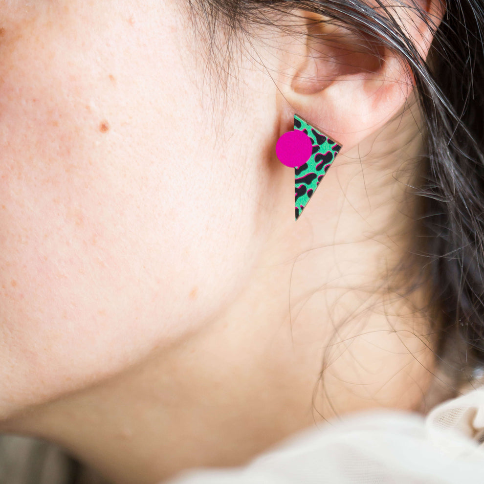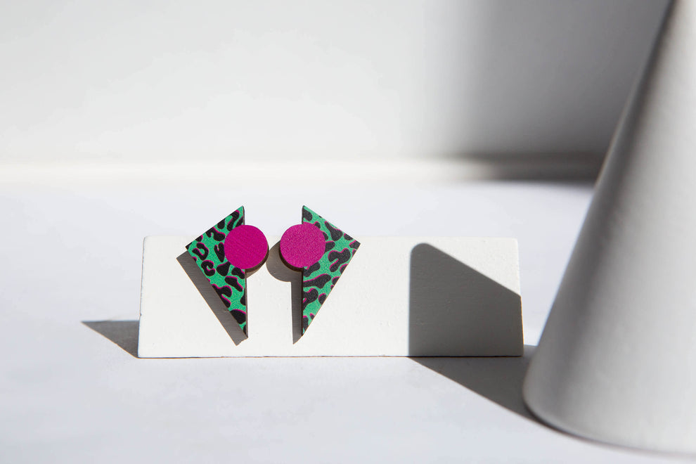 These geometric earrings feature a bold green leopard print design with a popping pink circle.