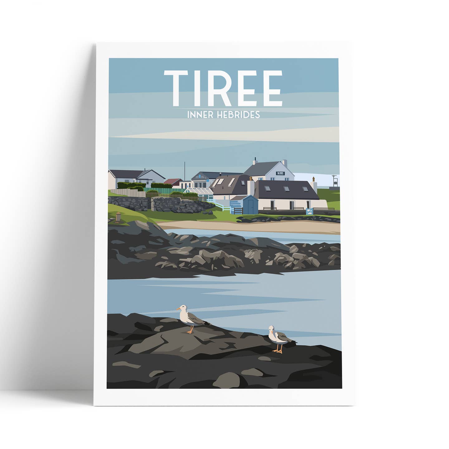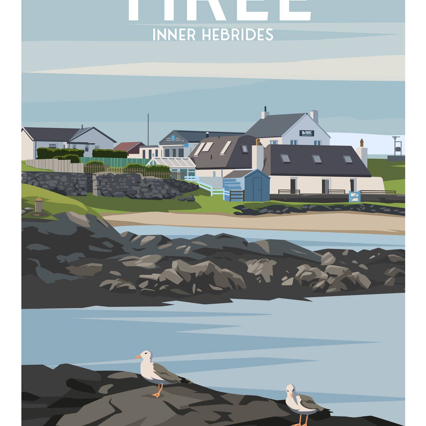 A contemporary illustrated travel poster of Scarinish, the main settlement on the Isle of Tiree in Scotland’s Inner Hebrides. This artwork depicts the village’s coastal houses overlooking the rocky shoreline, calm harbour waters, and seabirds resting on the foreshore, capturing the quiet, everyday character of island life.