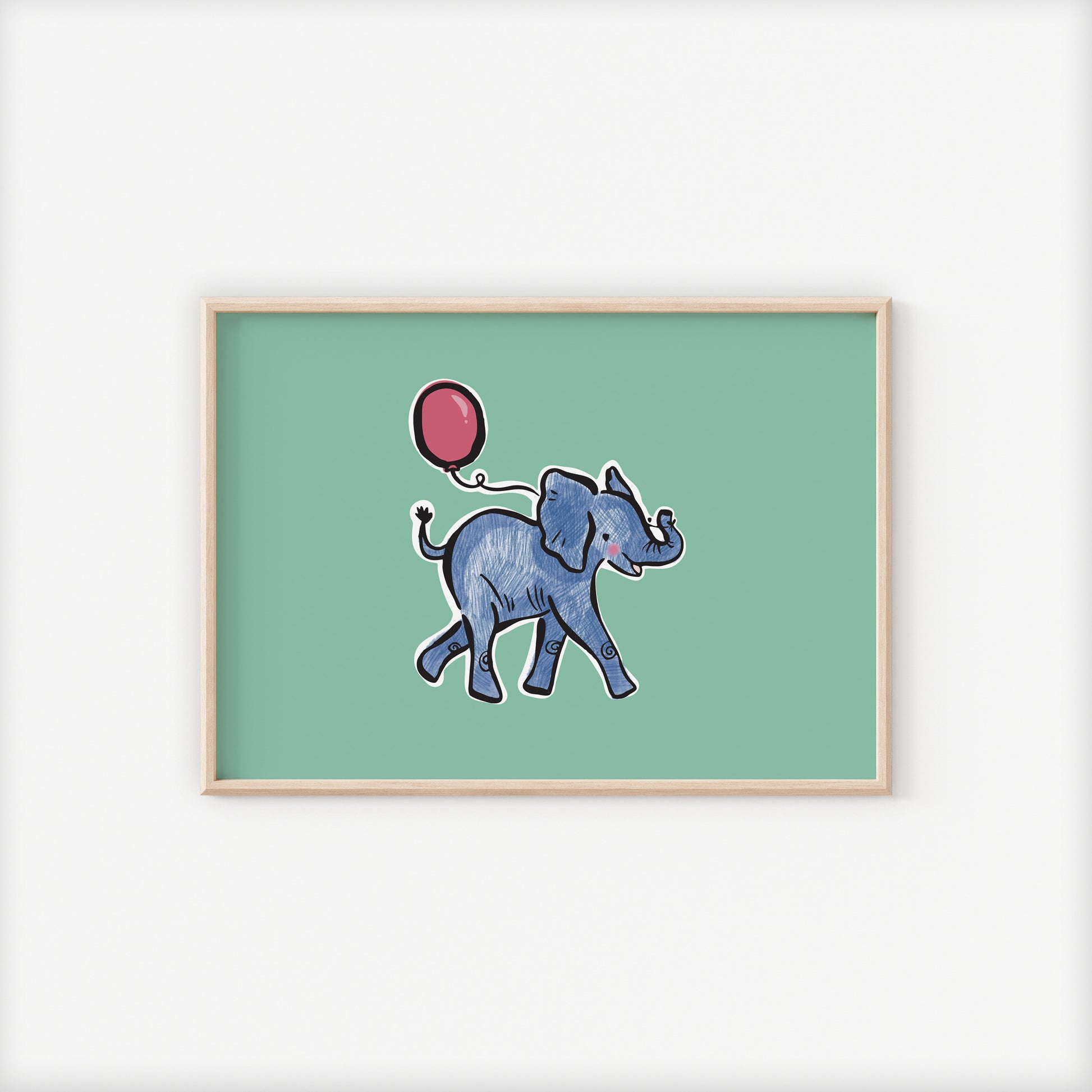 Bring a sense of whimsy and joy to your space with Neiro, the adorable baby elephant holding a vibrant pink balloon with his trunk. Set against a soft light green background which enhances his cheerful personality, making this print an ideal choice for animal lovers and anyone who appreciates colourful, whimsical art.