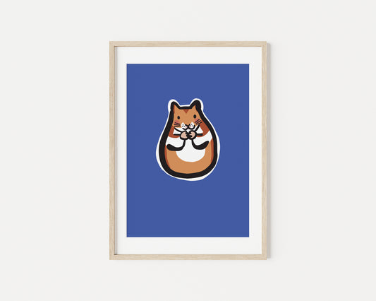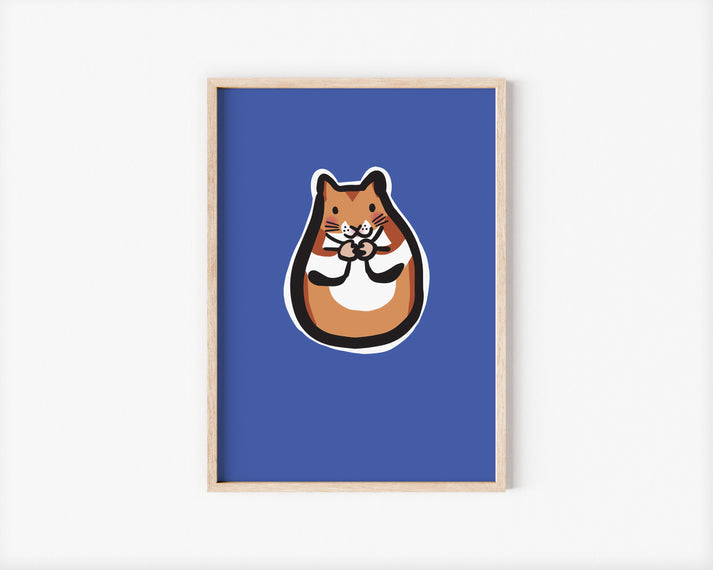 Add a touch of cuteness and charm to your space with Biscuit the Hamster, the golden orange Syrian hamster. Set against a vibrant royal blue background, Biscuit’s adorable, round face and fluffy fur bring warmth and joy to any room. Perfect for hamster lovers, children's rooms, or anyone who appreciates playful, endearing artwork, this print will add a cheerful pop of personality to your décor.