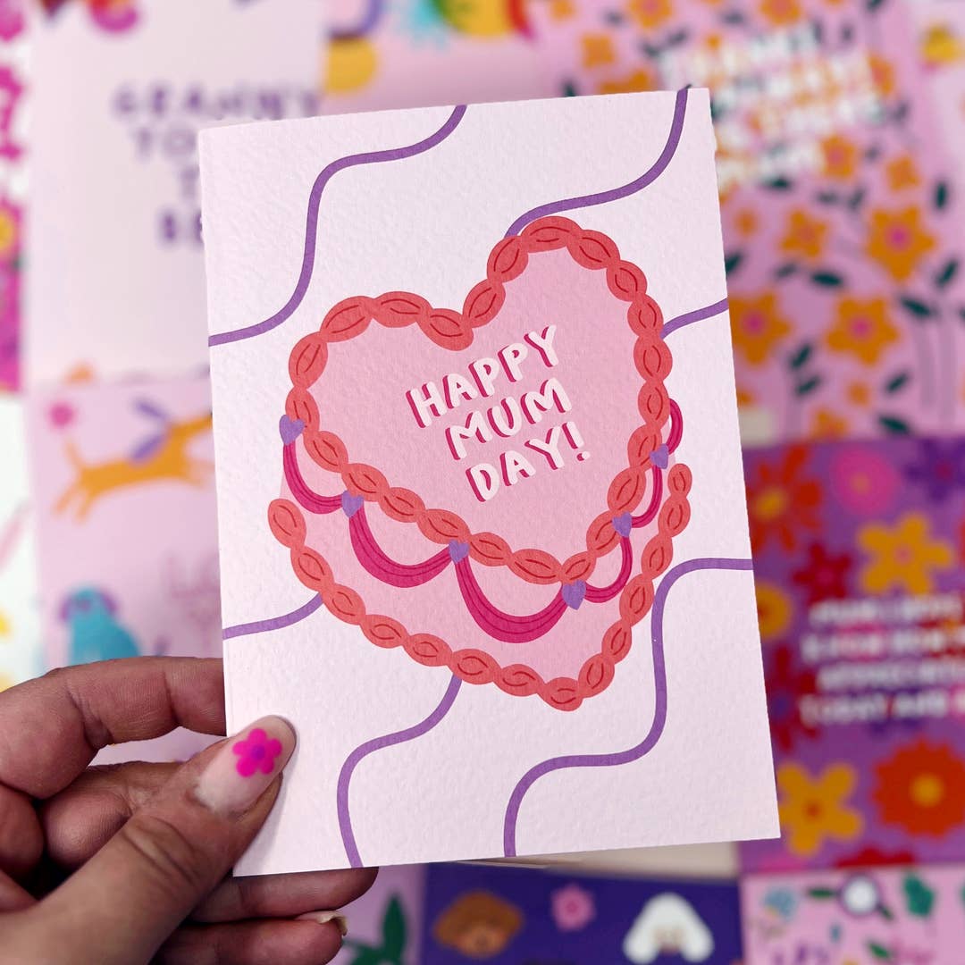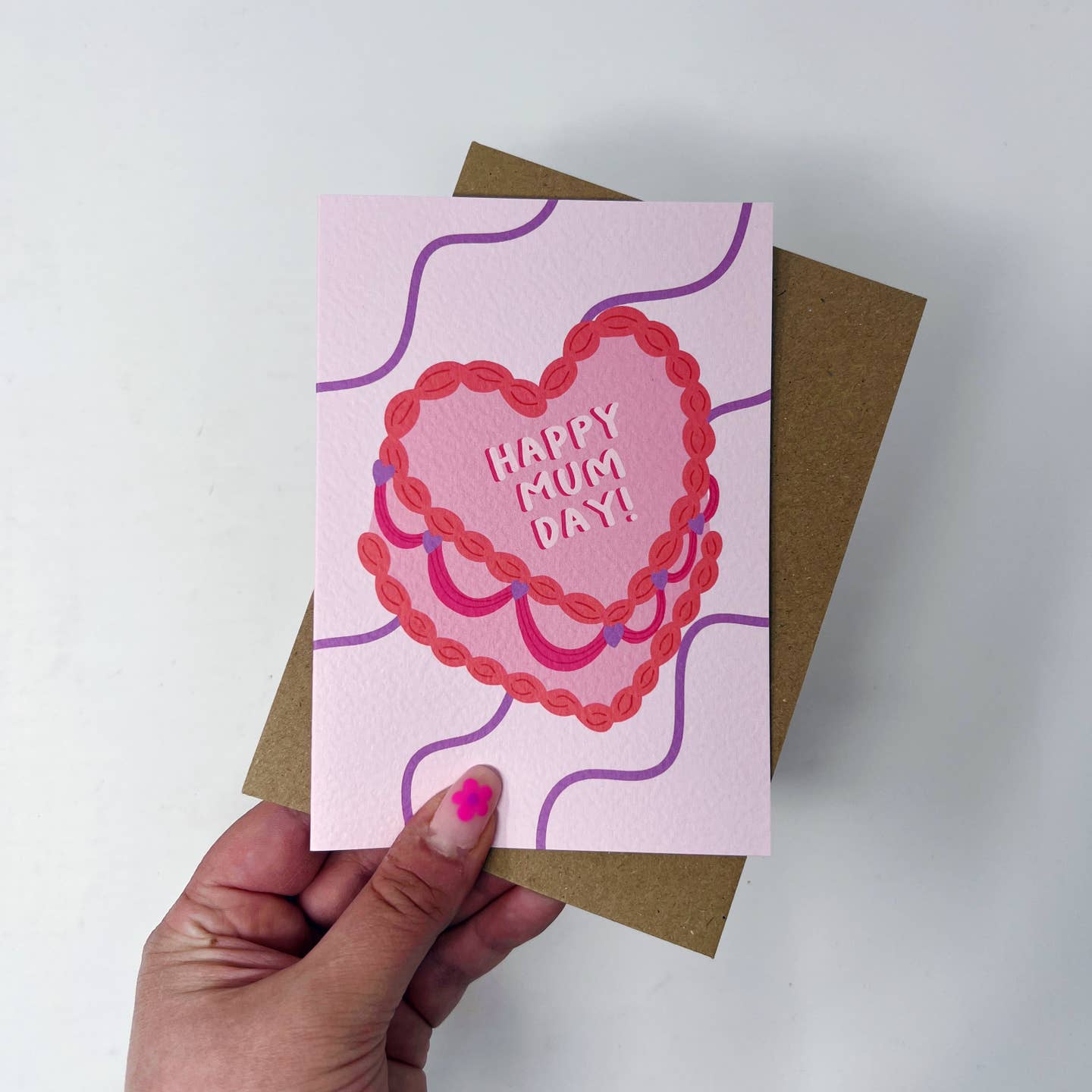This Happy Mum Day card features a bold heart cake illustration in a colourful, modern style, designed to celebrate mums in a warm and joyful way.