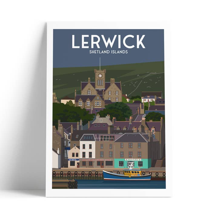 Capture the rugged beauty of Scotland’s northern isles with this striking travel poster of Lerwick, Shetland’s historic harbour town. Featuring layered hillside architecture, traditional stone buildings, and a colourful fishing boat resting in the marina, this illustration reflects the character and quiet charm that make Lerwick such a memorable destination. The muted coastal palette and clean, contemporary style allow this print to sit effortlessly within both modern and traditional interiors. Ideal for customers with a connection to the Shetland Islands, a love of maritime heritage, or an appreciation for scenic Scottish locations.