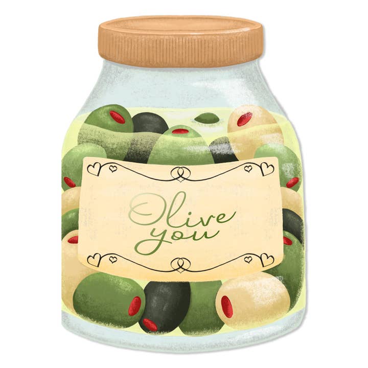 This is a quirky, illustrated die cut card featuring a jar of olives.