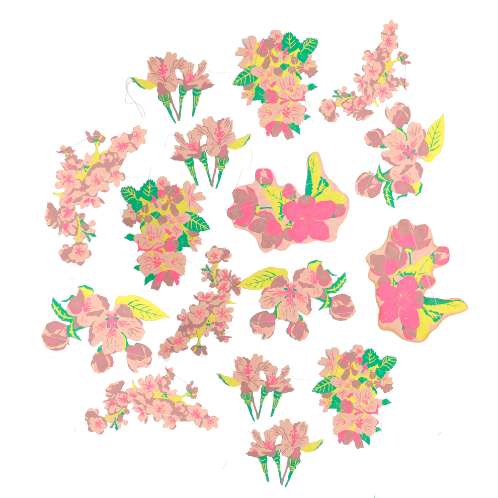 Hand printed three metre long paper garland inspired by cherry blossom trees, this garland has all the colours of Spring, with ten plump pink springs of flowers. The garland is printed on both sides on thick, hand made cotton paper. The shapes are sewn in a random order along strong cotton thread, with hanging loops either end, meaning the garland can be hung straight away!