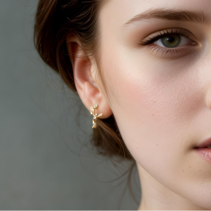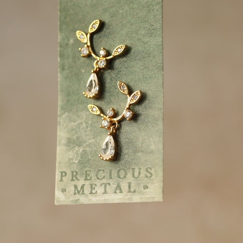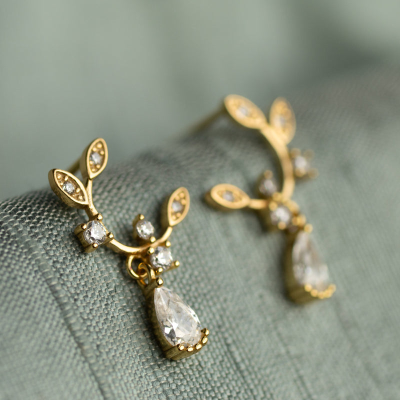 These sweet and dainty statement stud earrings feature a loop of leaves, formed in gold and crystal, with a tiny teardrop accent jewel hanging from the bottom.