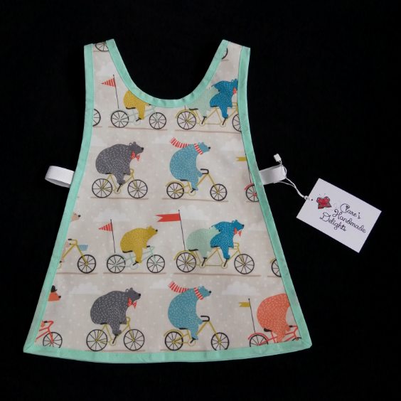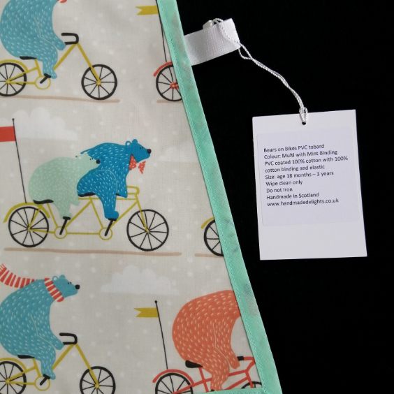 Fun oilcloth (100% cotton coated with wipe-clean PVC) children’s tabard, featuring bears on bikes prints Made by Clare's Handmade Delights, right here in Glasgow.