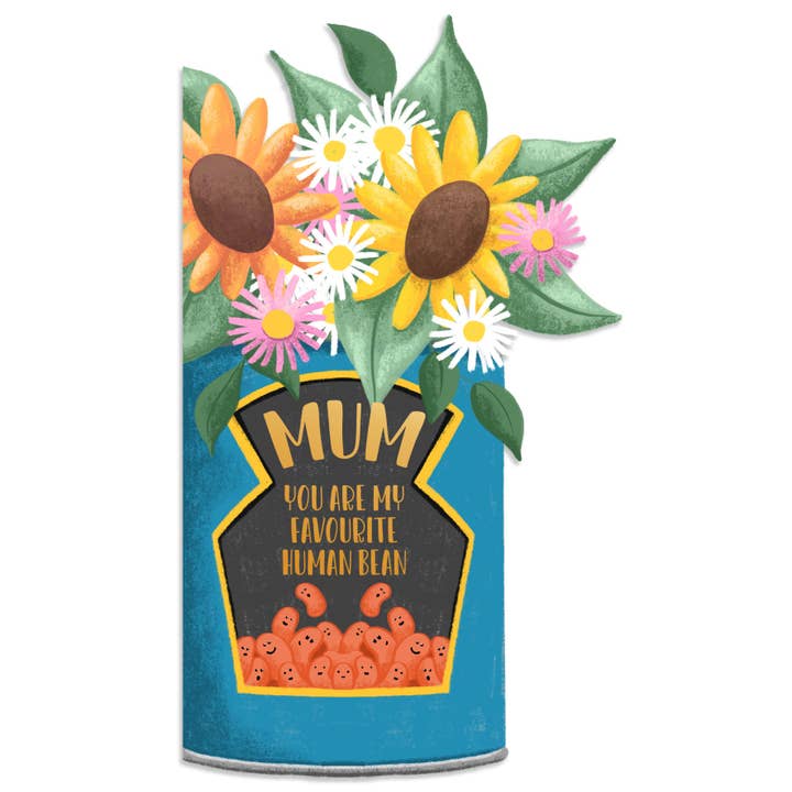 This is a quirky, illustrated die cut card featuring a family favourite tin of beans.